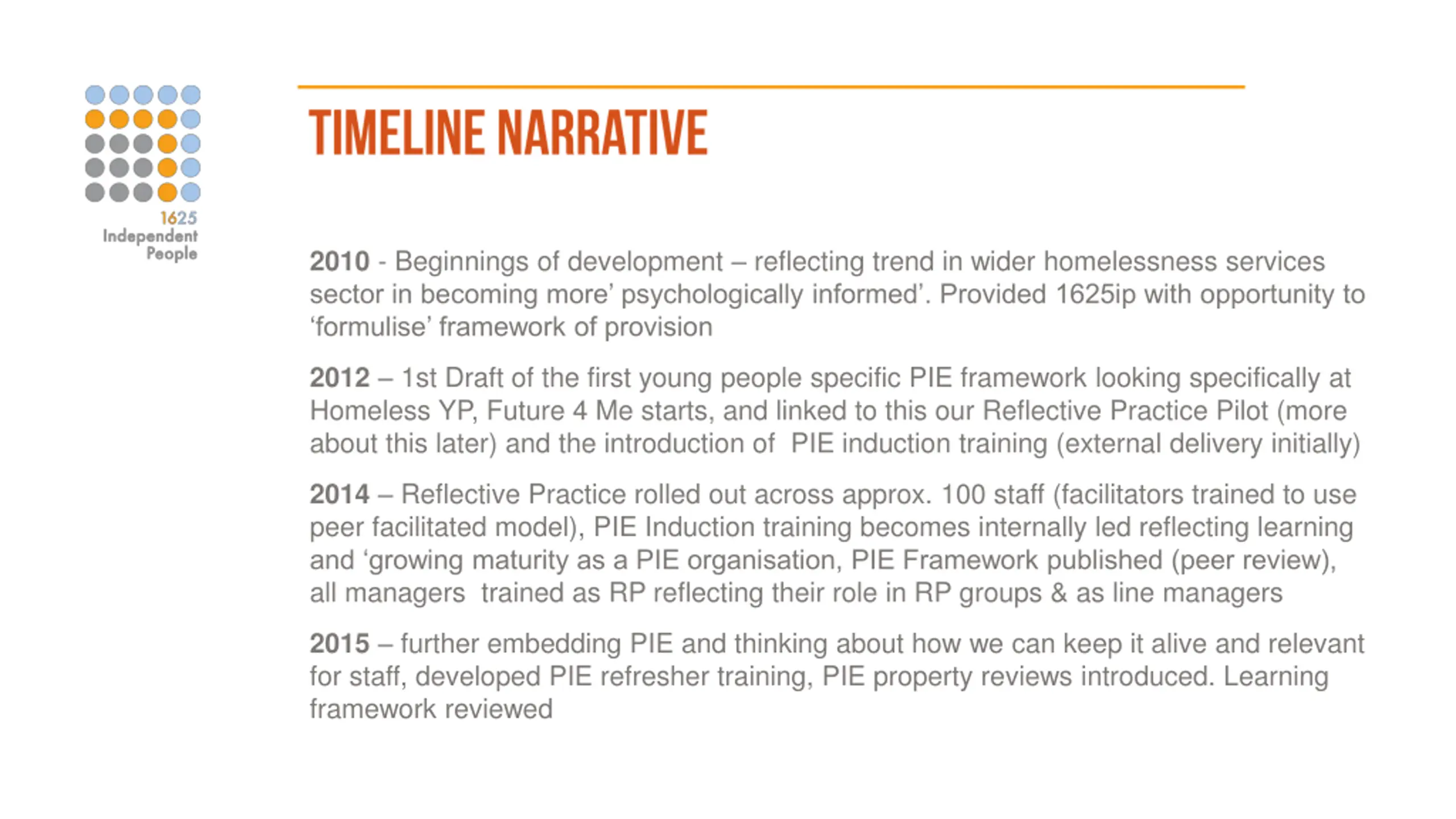 2010 - Beginnings of development reflecting trend in wider homelessness services sector in becoming more psychologically informed . Provided 1625ip with opportunity to formulise framework of provision 2012 1st Draft of the first young people specific PIE framework looking specifically at Homeless YP, Future 4 Me starts, and linked to this our Reflective Practice Pilot (more about this later) and the introduction of PIE induction training (external delivery initially) 2014 Reflective Practice rolled out across approx. 100 staff (facilitators trained to use peer facilitated model), PIE Induction training becomes internally led reflecting learning and growing maturity as a PIE organisation, PIE Framework published (peer review), all managers trained as RP reflecting their role in RP groups & as line managers 2015 further embedding PIE and thinking about how we can keep it alive and relevant for staff, developed PIE refresher training, PIE property reviews introduced. Learning framework reviewed