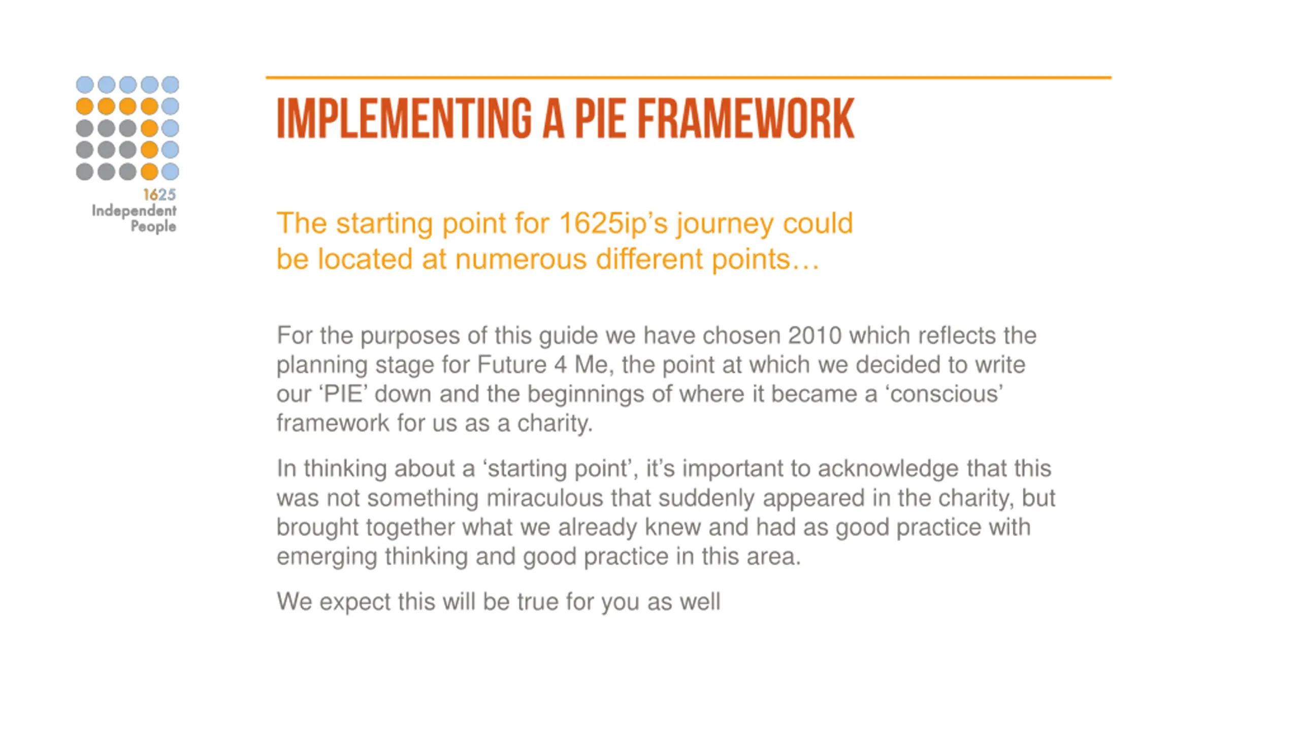 The starting point for 1625ips journey could be located at numerous different points For the purposes of this guide we have chosen 2010 which reflects the planning stage for Future 4 Me, the point at which we decided to write our PIE down and the beginnings of where it became a conscious framework for us as a charity. In thinking about a starting point , it s important to acknowledge that this was not something miraculous that suddenly appeared in the charity, but brought together what we already knew and had as good practice with emerging thinking and good practice in this area. We expect this will be true for you as well