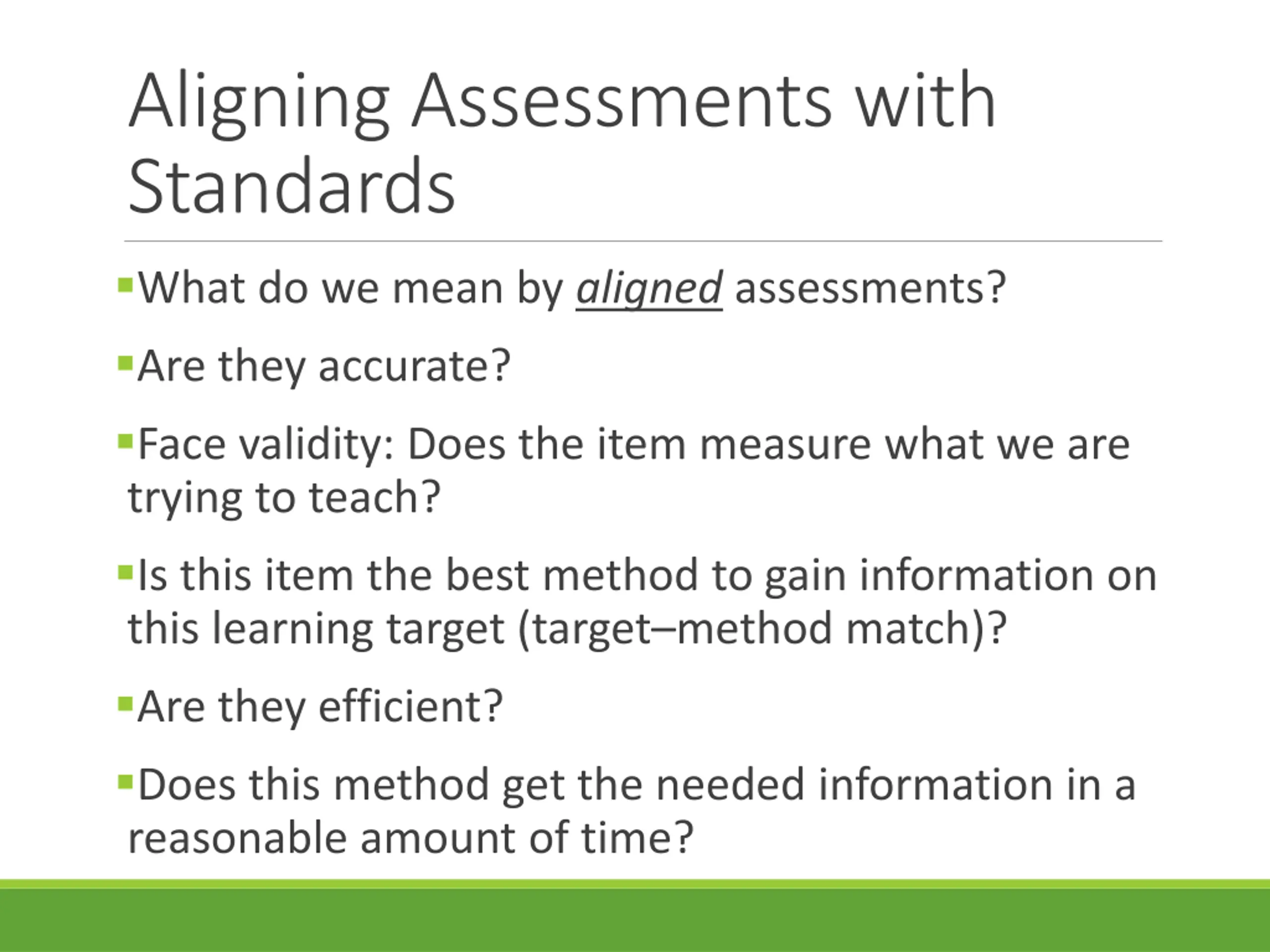 Aligning Assessments with Standards What do we mean by aligned assessments? Are they accurate? Face validity: Does the item measure what we are trying to teach? Is this item the best method to gain information on this learning target (target method match)? Are they efficient? Does this method get the needed information in a reasonable amount of time?