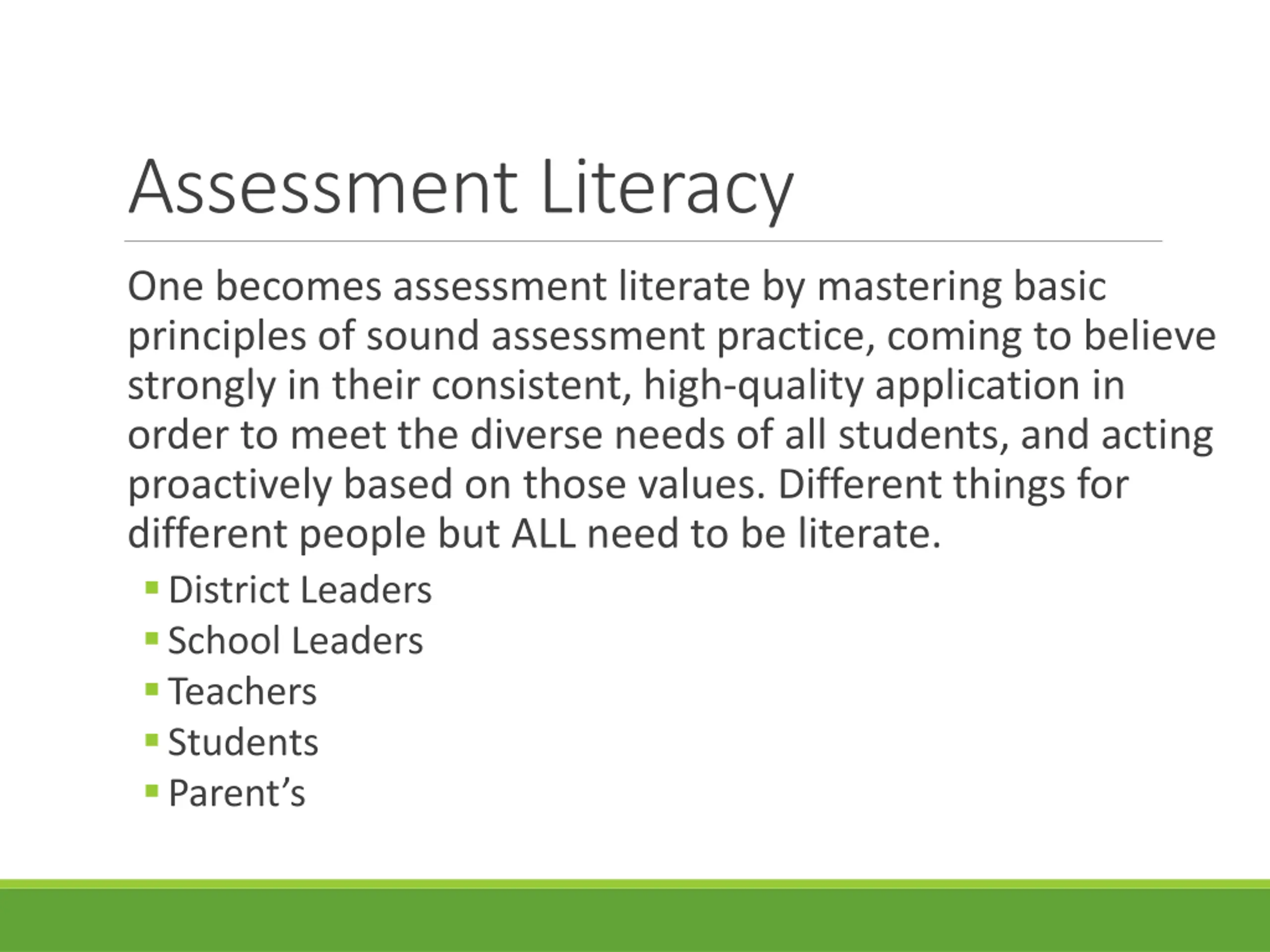 Assessment Literacy One becomes assessment literate by mastering basic principles of sound assessment practice, coming to believe strongly in their consistent, high-quality application in order to meet the diverse needs of all students, and acting proactively based on those values. Different things for different people but ALL need to be literate. District Leaders School Leaders Teachers Students Parent s