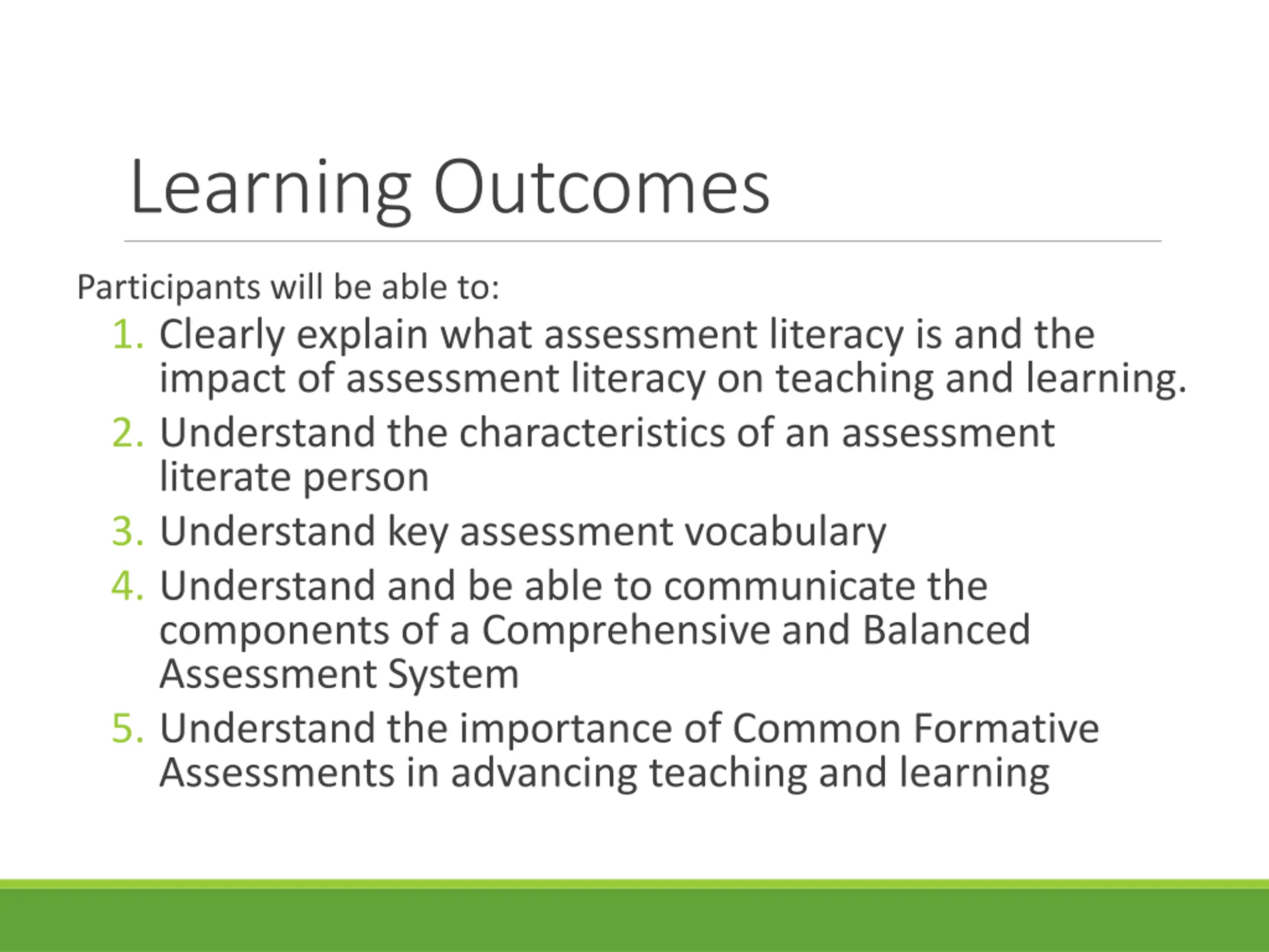 Learning Outcomes Participants will be able to: 1. Clearly explain what assessment literacy is and the impact of assessment literacy on teaching and learning. 2. Understand the characteristics of an assessment literate person 3. Understand key assessment vocabulary 4. Understand and be able to communicate the components of a Comprehensive and Balanced Assessment System 5. Understand the importance of Common Formative Assessments in advancing teaching and learning