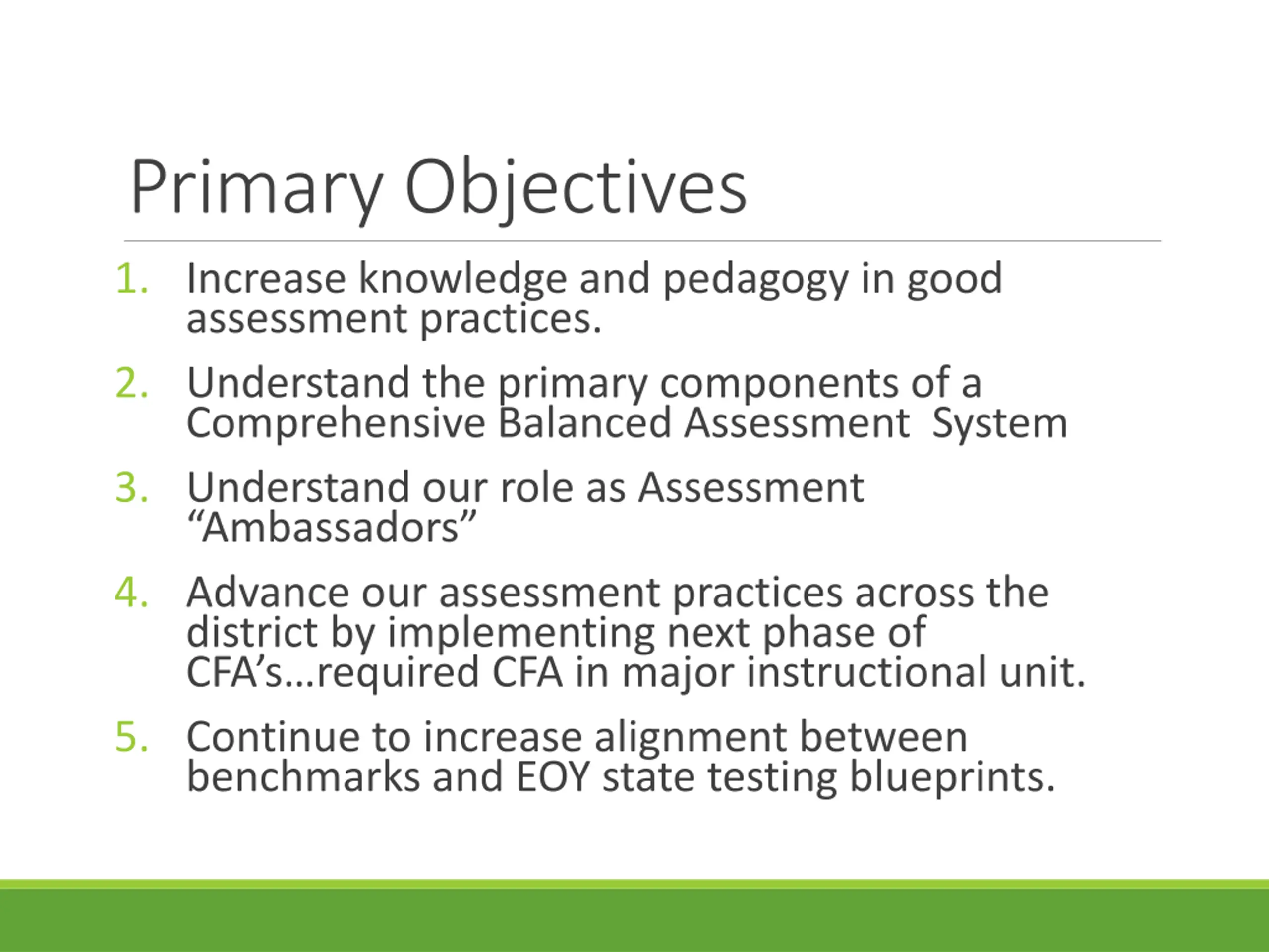 Primary Objectives 1. Increase knowledge and pedagogy in good assessment practices. 2. Understand the primary components of a Comprehensive Balanced Assessment System 3. Understand our role as Assessment Ambassadors 4. Advance our assessment practices across the district by implementing next phase of CFA s required CFA in major instructional unit. 5. Continue to increase alignment between benchmarks and EOY state testing blueprints.