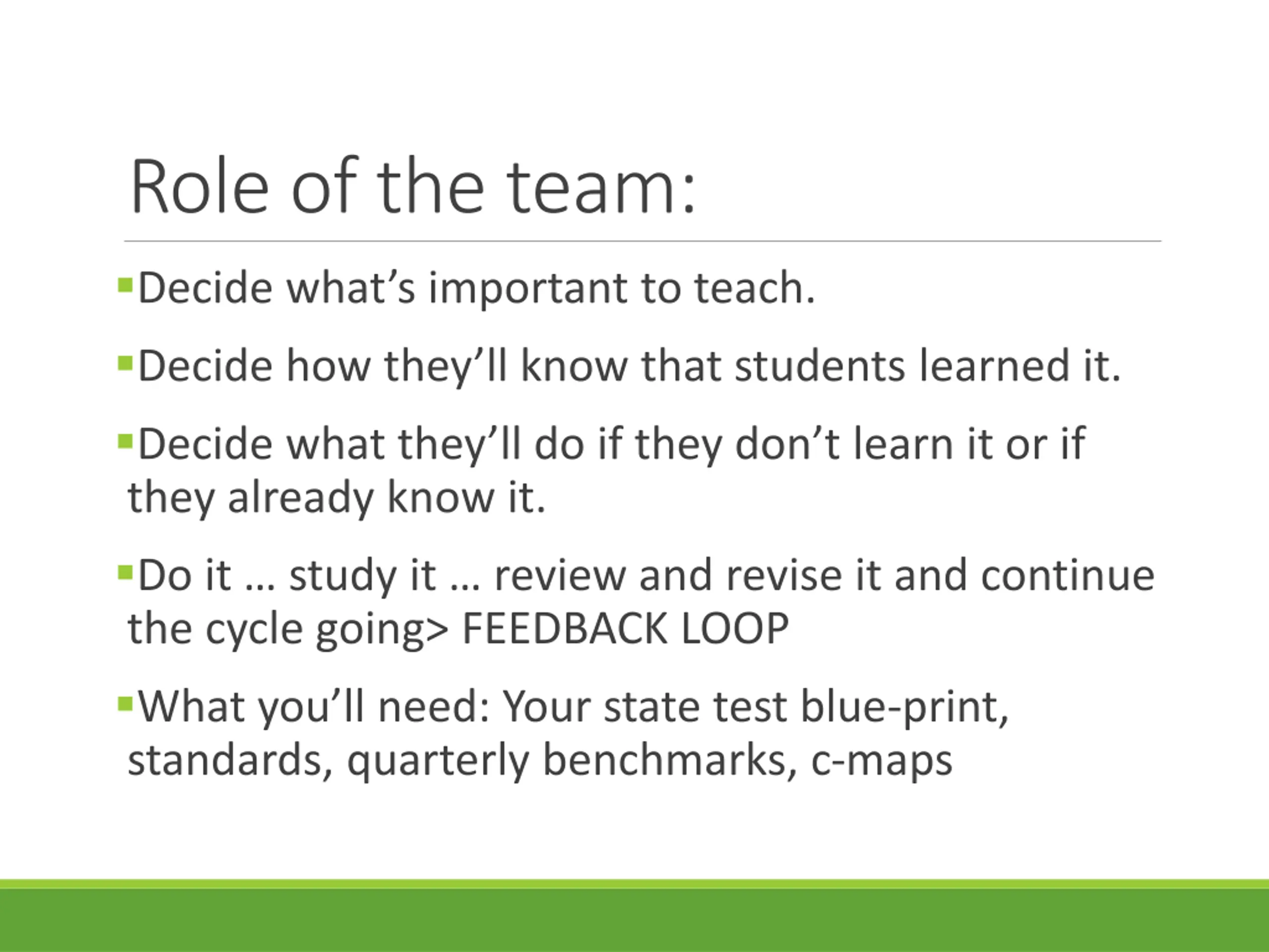 Role of the team: Decide what s important to teach. Decide how they ll know that students learned it. Decide what they ll do if they don t learn it or if they already know it. Do it study it review and revise it and continue the cycle going> FEEDBACK LOOP What you ll need: Your state test blue-print, standards, quarterly benchmarks, c-maps