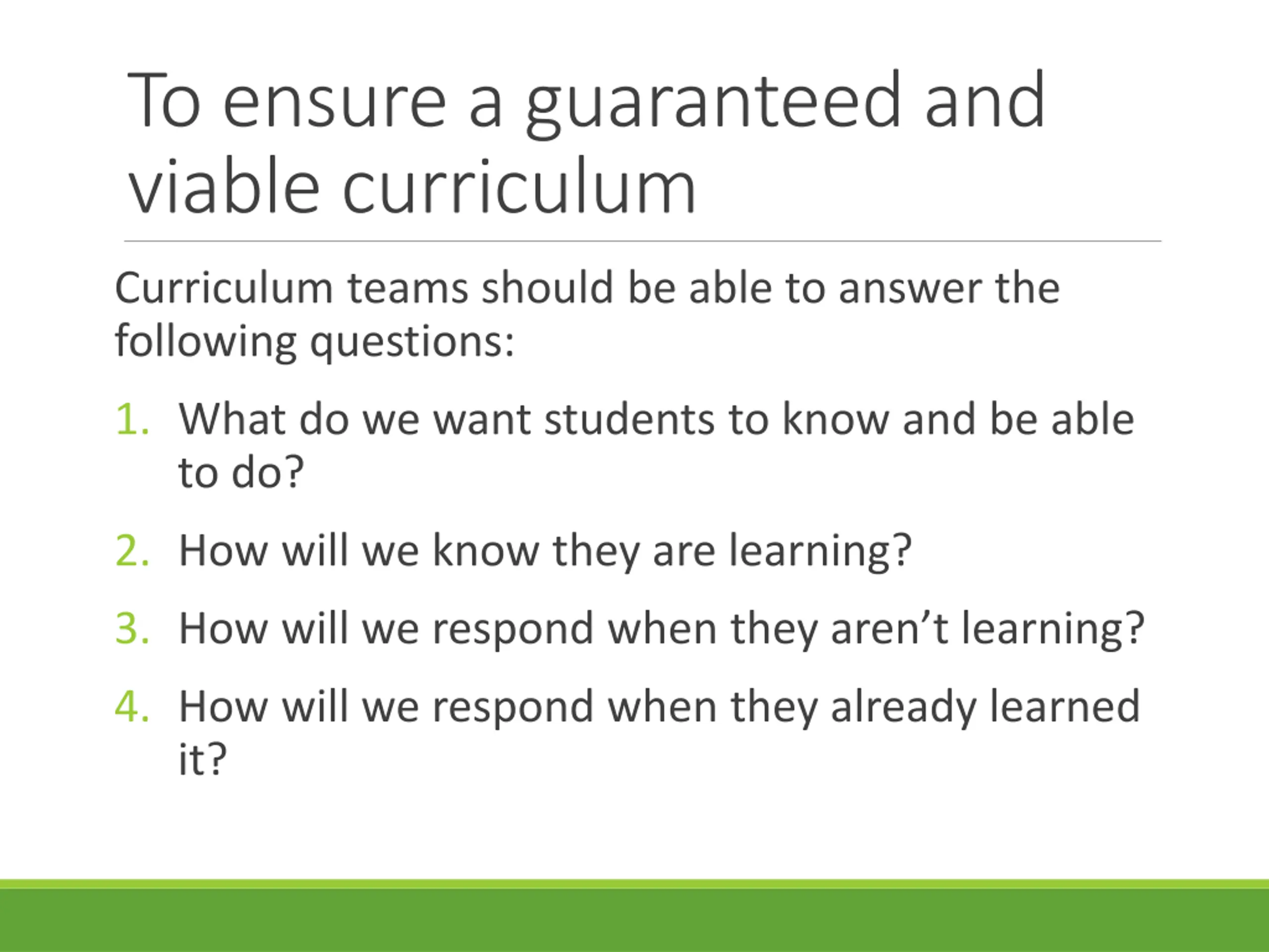 To ensure a guaranteed and viable curriculum Curriculum teams should be able to answer the following questions: 1. What do we want students to know and be able to do? 2. How will we know they are learning? 3. How will we respond when they aren t learning? 4. How will we respond when they already learned it?