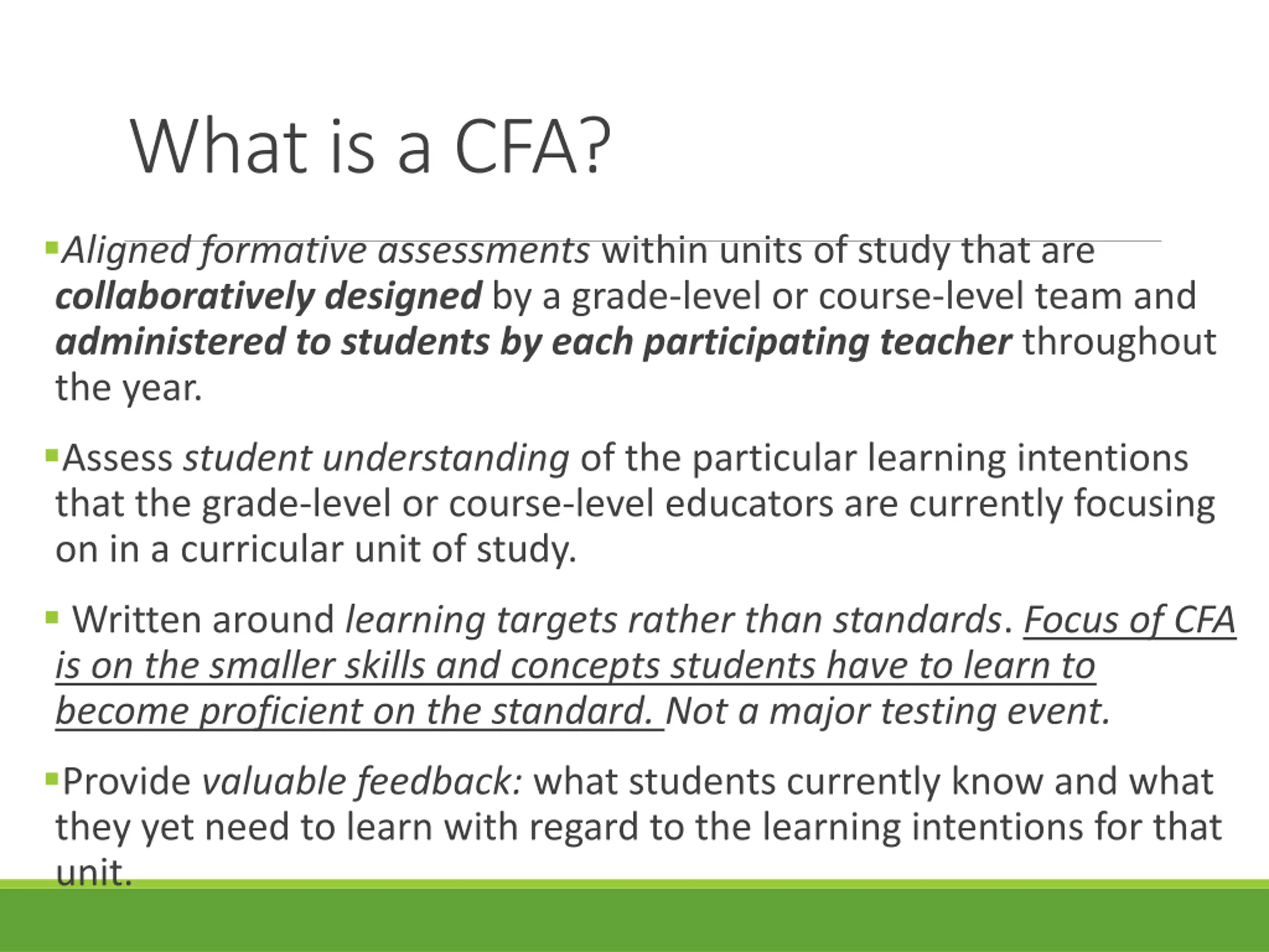 What is a CFA? Aligned formative assessments within units of study that are collaboratively designed by a grade level or course level team and administered to students by each participating teacher throughout the year. Assess student understanding of the particular learning intentions that the grade level or course level educators are currently focusing on in a curricular unit of study. Written around learning targets rather than standards. Focus of CFA is on the smaller skills and concepts students have to learn to become proficient on the standard. Not a major testing event. Provide valuable feedback: what students currently know and what they yet need to learn with regard to the learning intentions for that unit.