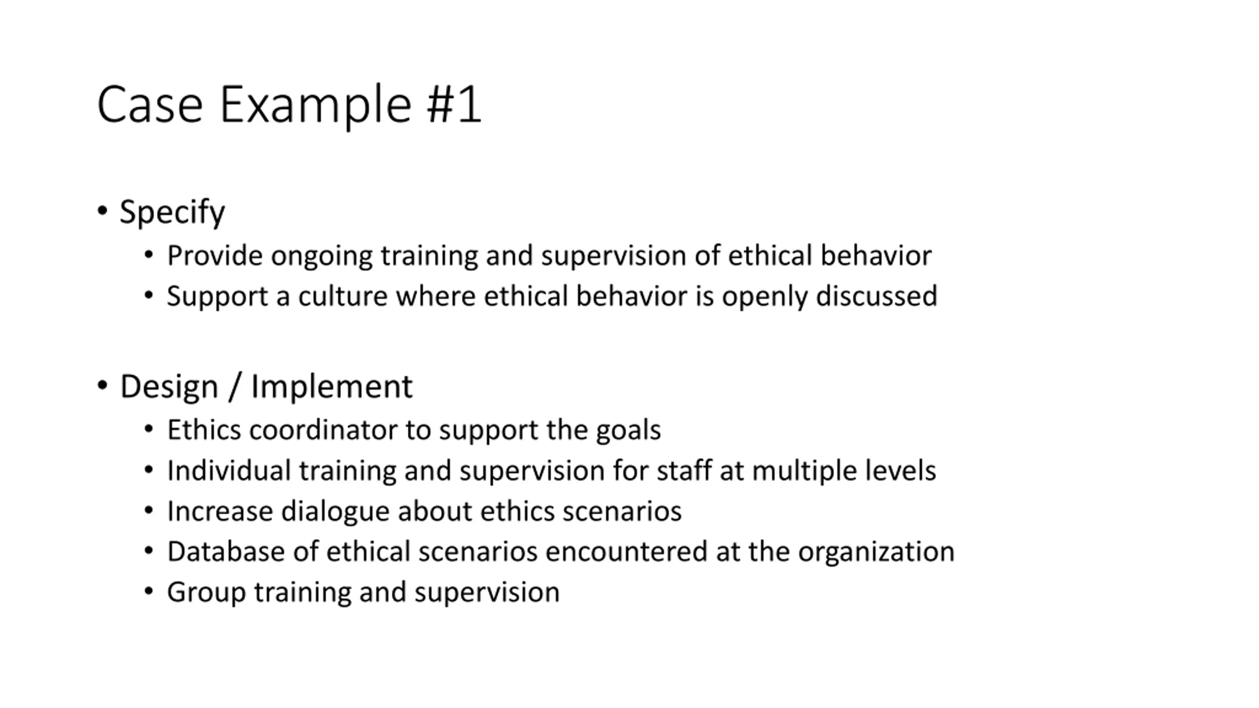 Case Example #1 Specify Provide ongoing training and supervision of ethical behavior Support a culture where ethical behavior is openly discussed Design / Implement Ethics coordinator to support the goals Individual training and supervision for staff at multiple levels Increase dialogue about ethics scenarios Database of ethical scenarios encountered at the organization Group training and supervision