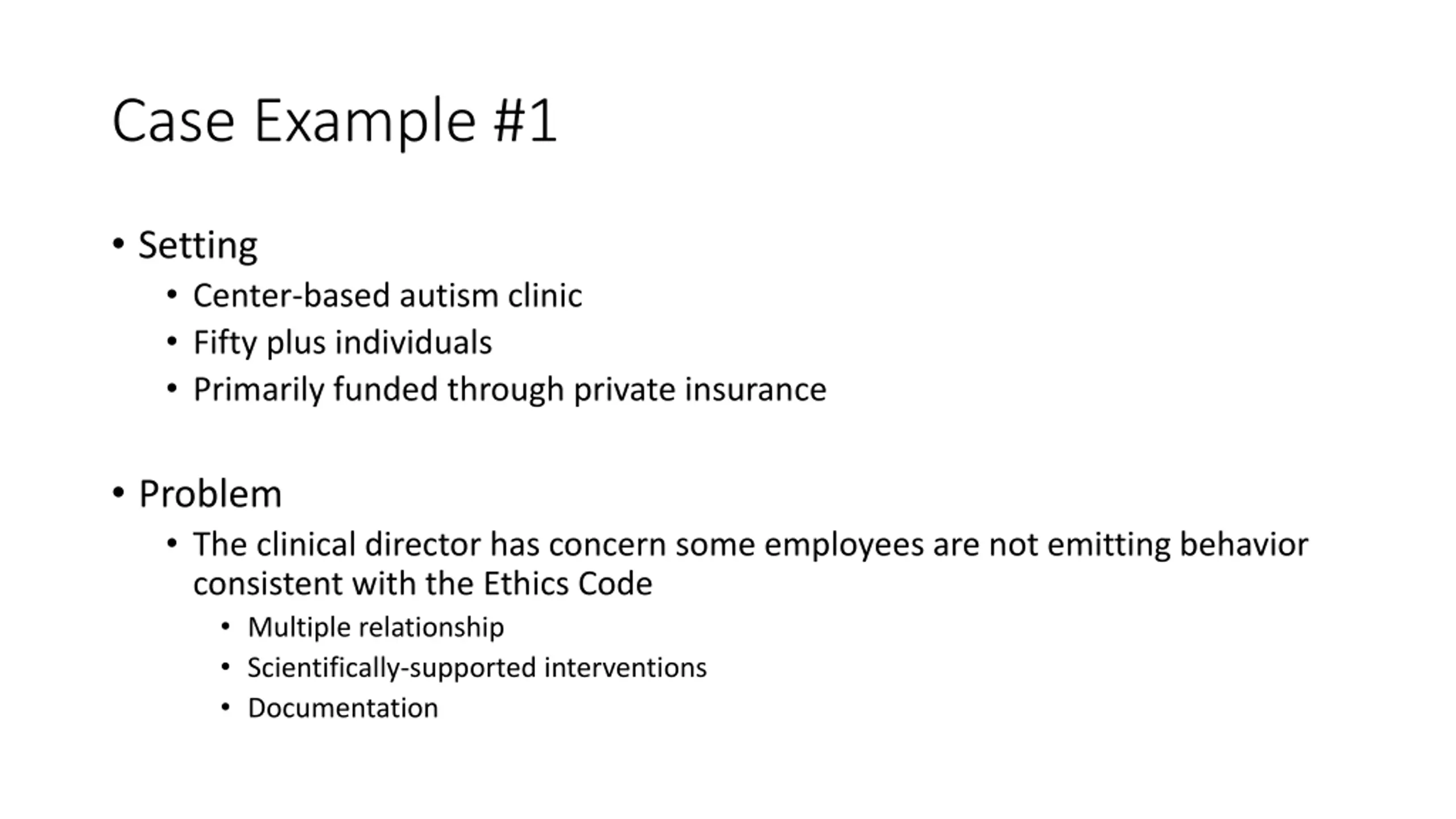Case Example #1 Setting Center-based autism clinic Fifty plus individuals Primarily funded through private insurance Problem The clinical director has concern some employees are not emitting behavior consistent with the Ethics Code Multiple relationship Scientifically-supported interventions Documentation