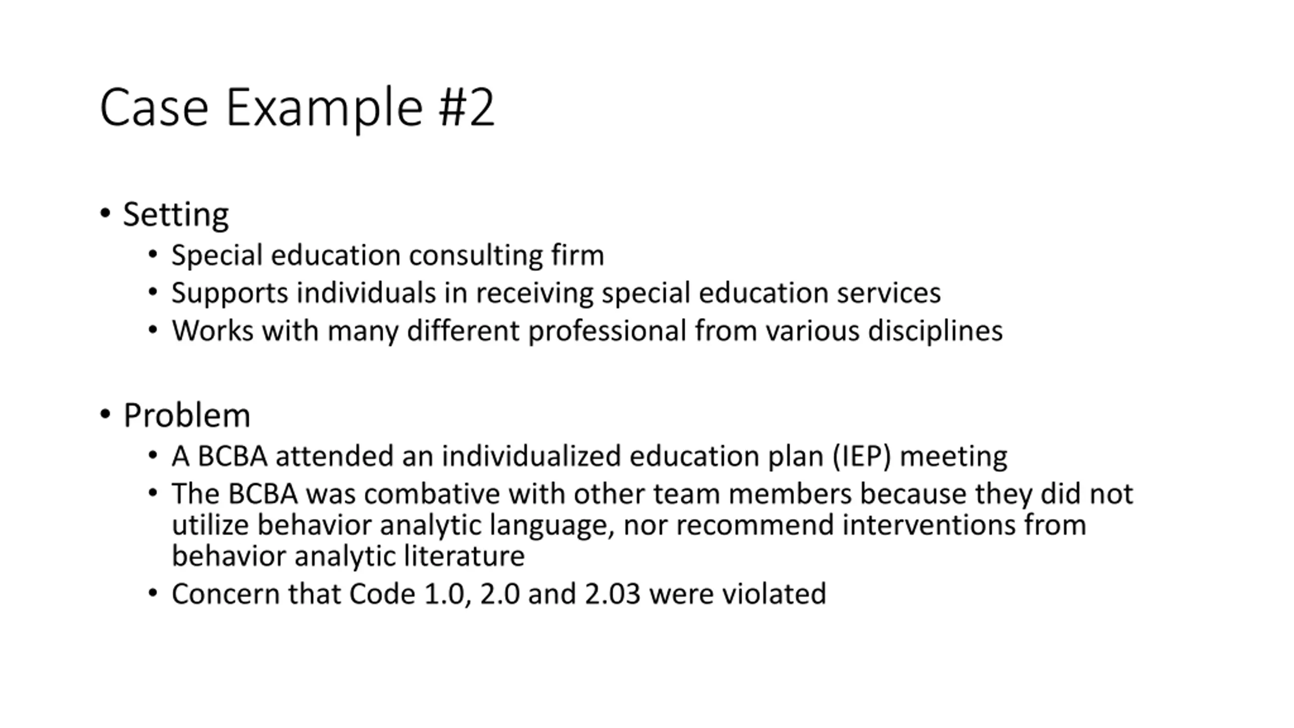 Case Example #2 Setting Special education consulting firm Supports individuals in receiving special education services Works with many different professional from various disciplines Problem A BCBA attended an individualized education plan (IEP) meeting The BCBA was combative with other team members because they did not utilize behavior analytic language, nor recommend interventions from behavior analytic literature Concern that Code 1.0, 2.0 and 2.03 were violated
