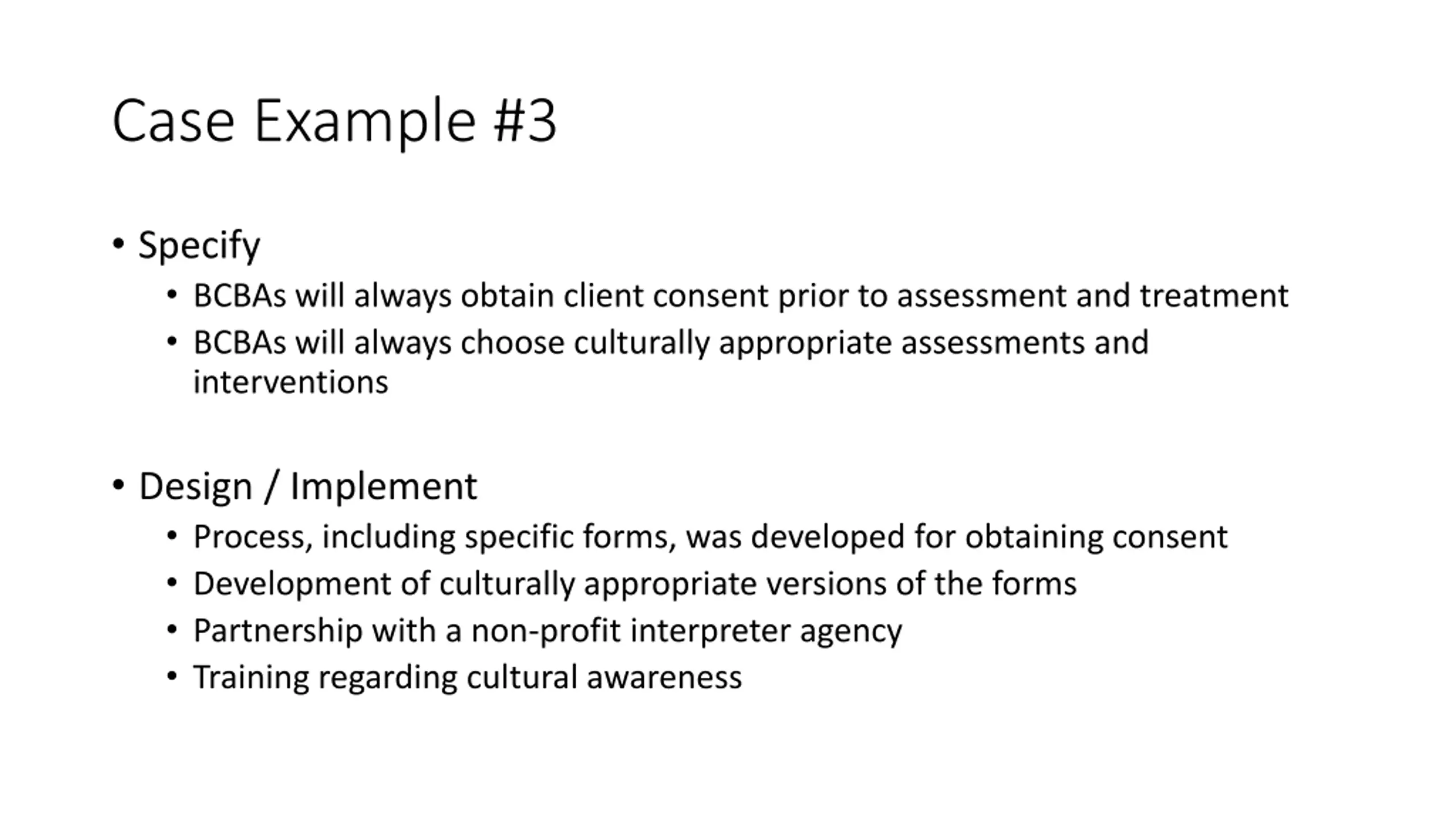 Case Example #3 Specify BCBAs will always obtain client consent prior to assessment and treatment BCBAs will always choose culturally appropriate assessments and interventions Design / Implement Process, including specific forms, was developed for obtaining consent Development of culturally appropriate versions of the forms Partnership with a non-profit interpreter agency Training regarding cultural awareness