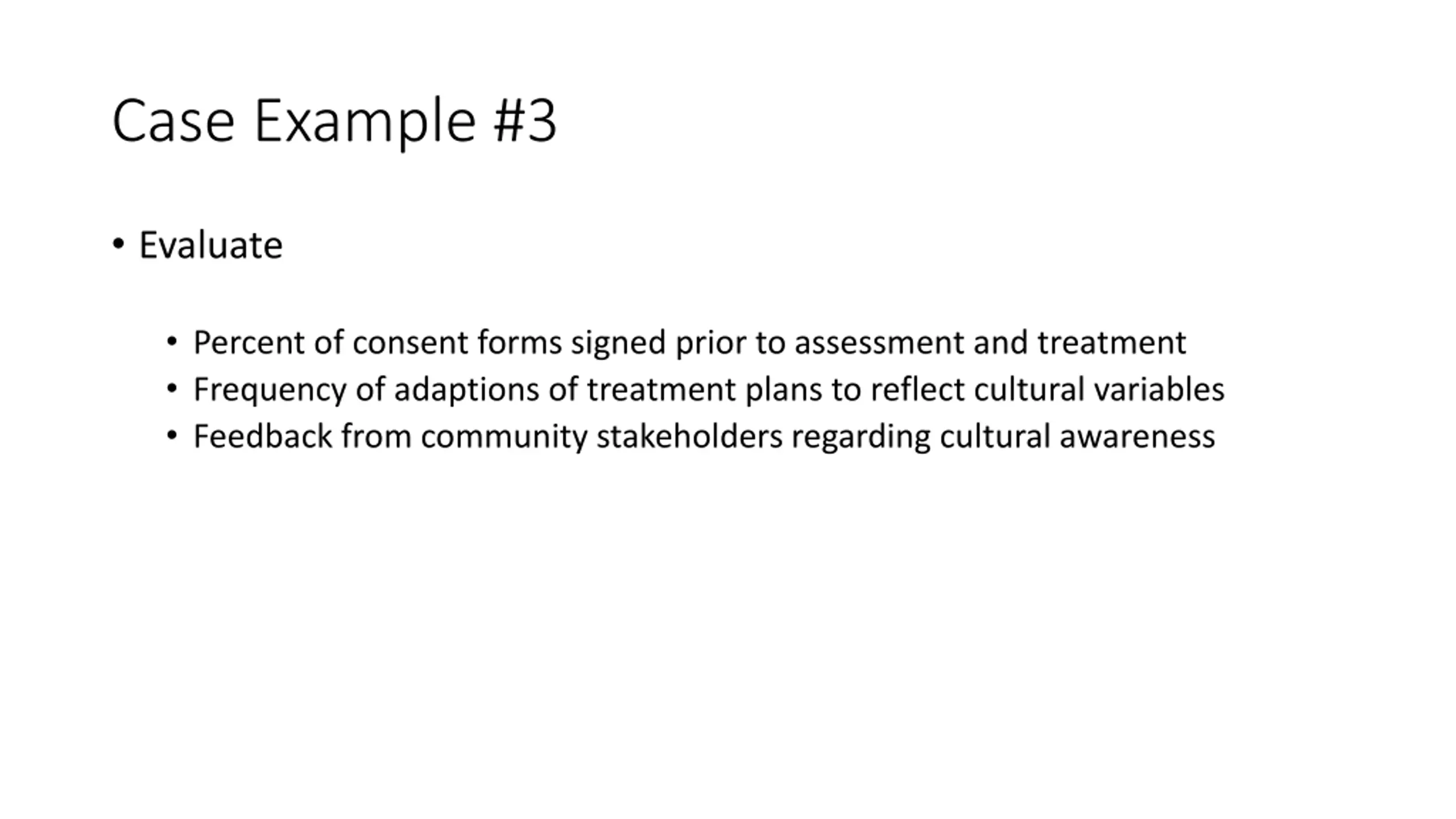 Case Example #3 Evaluate Percent of consent forms signed prior to assessment and treatment Frequency of adaptions of treatment plans to reflect cultural variables Feedback from community stakeholders regarding cultural awareness