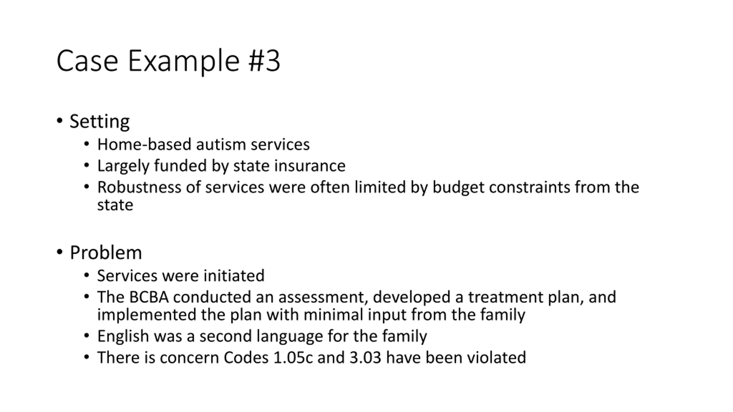 Case Example #3 Setting Home-based autism services Largely funded by state insurance Robustness of services were often limited by budget constraints from the state Problem Services were initiated The BCBA conducted an assessment, developed a treatment plan, and implemented the plan with minimal input from the family English was a second language for the family There is concern Codes 1.05c and 3.03 have been violated
