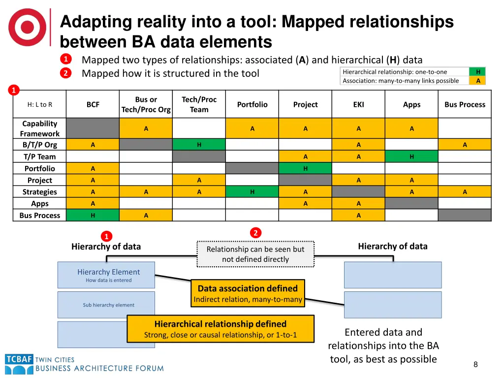 Adapting reality into a tool: Mapped relationships between BA data elements 1. Mapped two types of relationships: associated (A) and hierarchical (H) data 2. Mapped how it is structured in the tool 2 1 Hierarchical relationship: one-to-one Association: many-to-many links possible H A 1 Bus or Tech/Proc Team BCF Portfolio Project EKI Apps Bus Process H: L to R Tech/Proc Org Capability Framework B/T/P Org T/P Team Portfolio Project Strategies Apps Bus Process A A A A A A H A A A A H A H A A A A A A A H A A A A A A H A A 2 1 Hierarchy of data Hierarchy of data Relationship can be seen but not defined directly Hierarchy Element How data is entered Data association defined Indirect relation, many-to-many Sub hierarchy element Hierarchical relationship defined Strong, close or causal relationship, or 1-to-1 Entered data and relationships into the BA tool, as best as possible 8