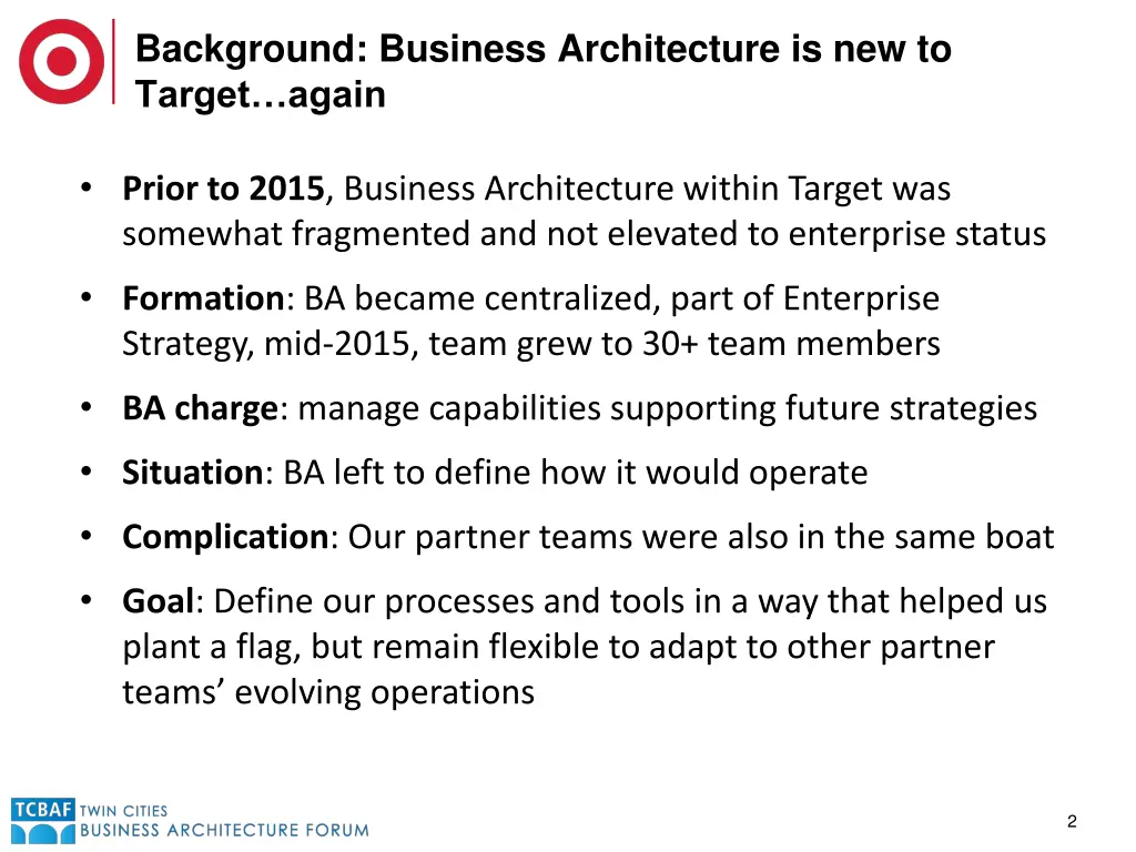 Background: Business Architecture is new to Target again Prior to 2015, Business Architecture within Target was somewhat fragmented and not elevated to enterprise status Formation: BA became centralized, part of Enterprise Strategy, mid-2015, team grew to 30+ team members BA charge: manage capabilities supporting future strategies Situation: BA left to define how it would operate Complication: Our partner teams were also in the same boat Goal: Define our processes and tools in a way that helped us plant a flag, but remain flexible to adapt to other partner teams evolving operations 2