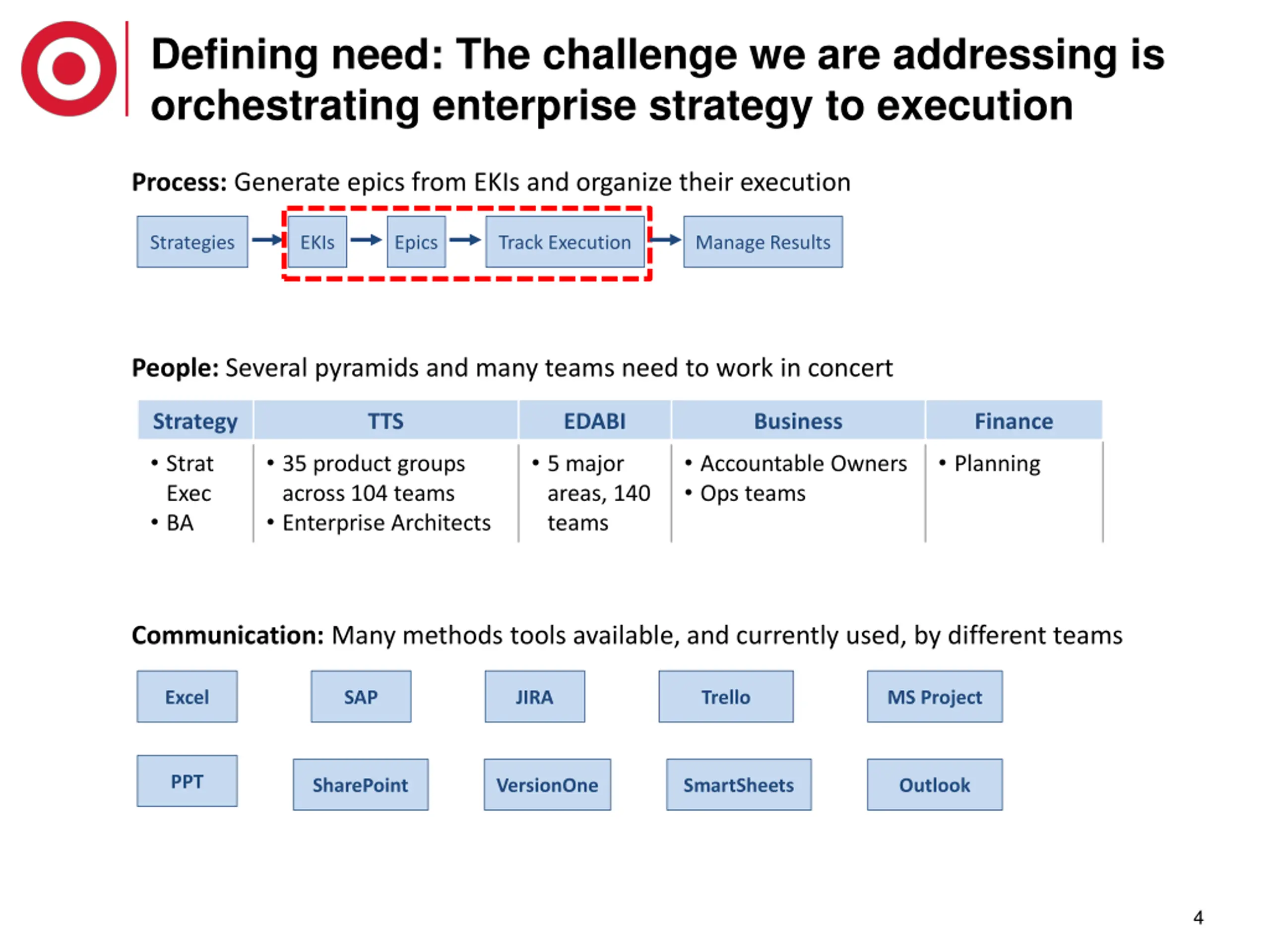 Defining need: The challenge we are addressing is orchestrating enterprise strategy to execution Process: Generate epics from EKIs and organize their execution Strategies EKIs Epics Track Execution Manage Results People: Several pyramids and many teams need to work in concert Strategy TTS EDABI Business Finance Strat Exec BA 35 product groups across 104 teams Enterprise Architects 5 major areas, 140 teams Accountable Owners Ops teams Planning Communication: Many methods tools available, and currently used, by different teams Excel SAP JIRA Trello MS Project PPT SharePoint VersionOne SmartSheets Outlook 4