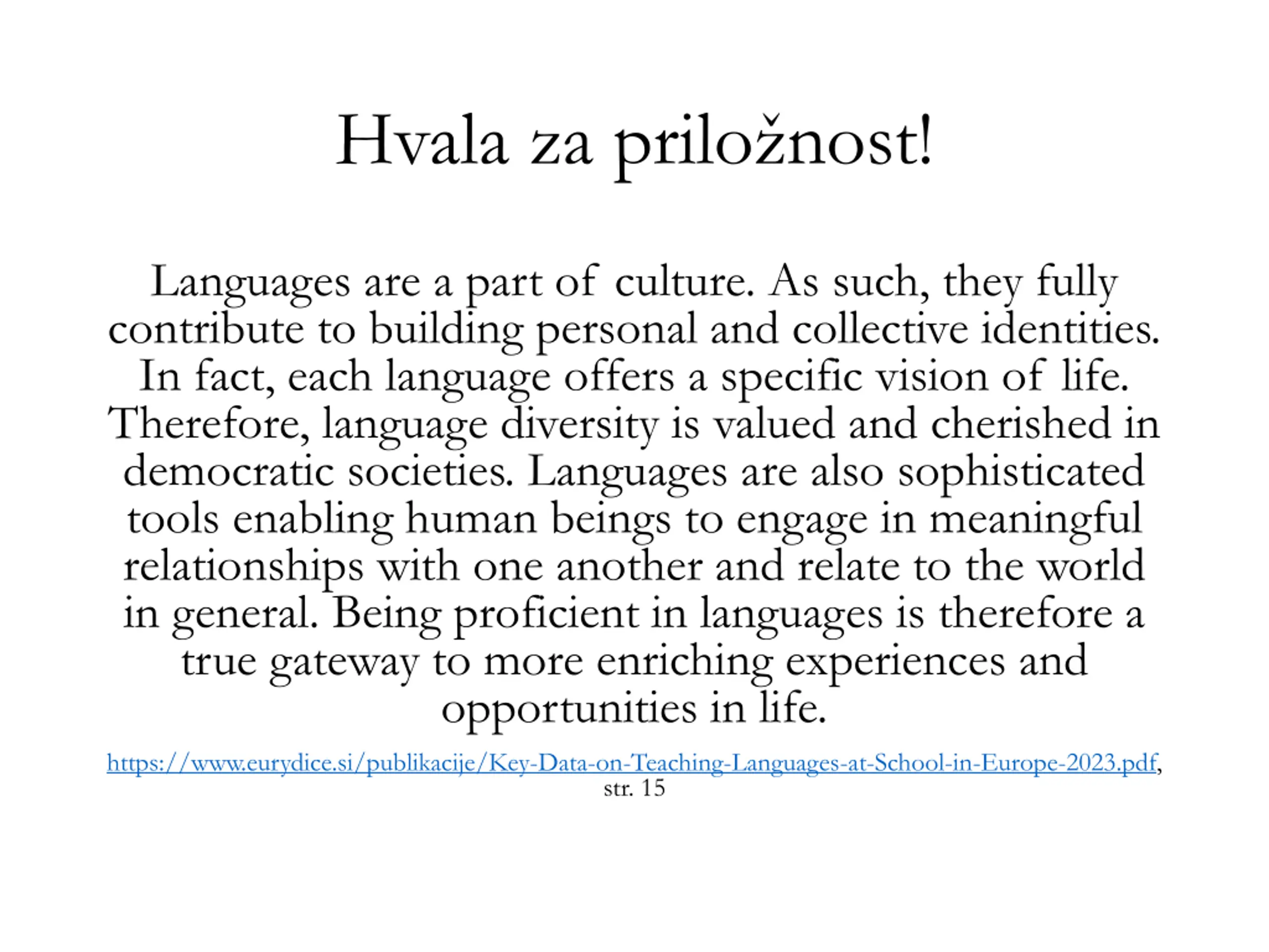 Hvala za prilonost! Languages are a part of culture. As such, they fully contribute to building personal and collective identities. In fact, each language offers a specific vision of life. Therefore, language diversity is valued and cherished in democratic societies. Languages are also sophisticated tools enabling human beings to engage in meaningful relationships with one another and relate to the world in general. Being proficient in languages is therefore a true gateway to more enriching experiences and opportunities in life. https://www.eurydice.si/publikacije/Key-Data-on-Teaching-Languages-at-School-in-Europe-2023.pdf, str. 15