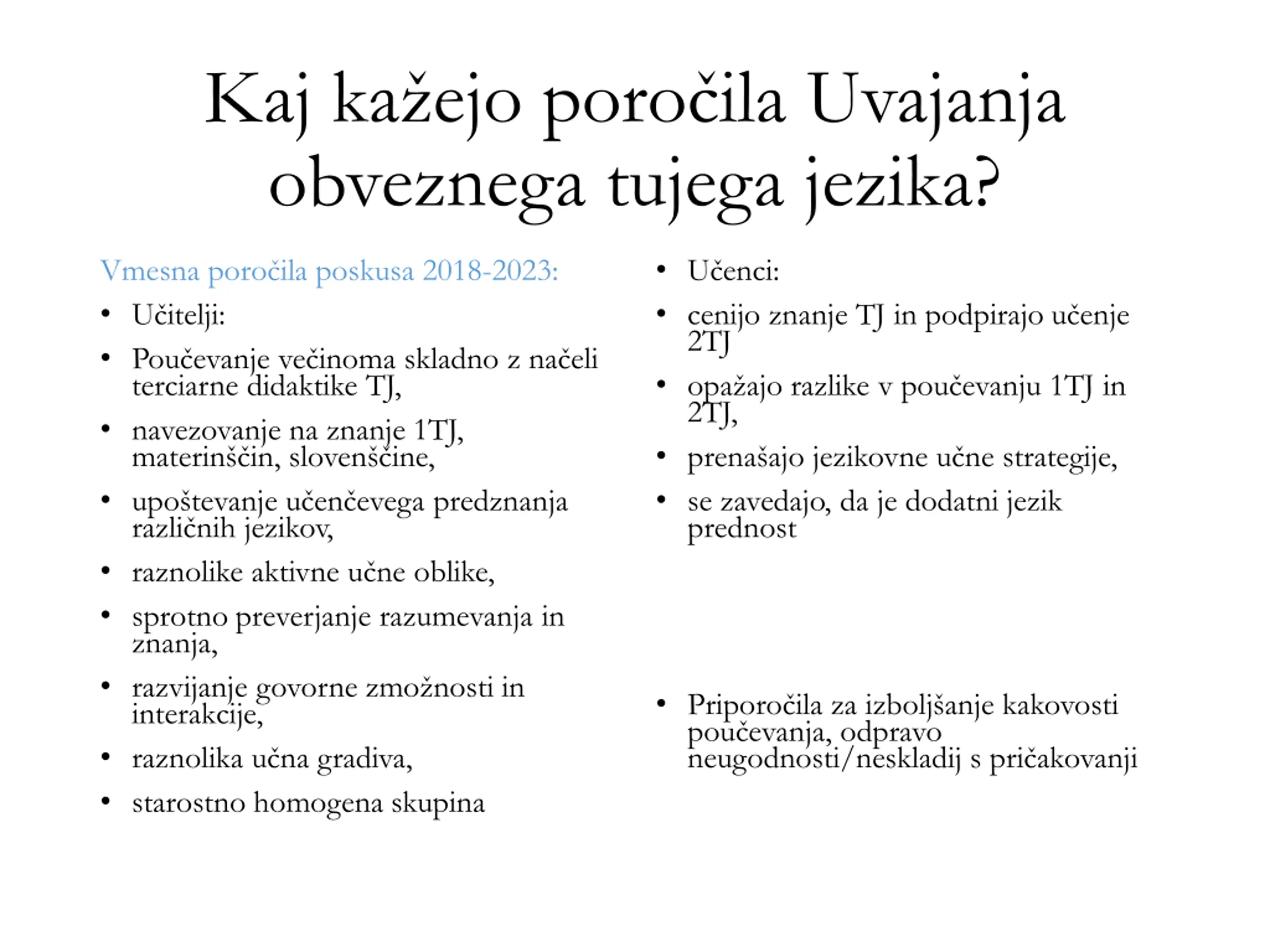 Kaj kaejo poroila Uvajanja obveznega tujega jezika? U enci: cenijo znanje TJ in podpirajo u enje 2TJ opa ajo razlike v pou evanju 1TJ in 2TJ, prena ajo jezikovne u ne strategije, se zavedajo, da je dodatni jezik prednost Vmesna poro ila poskusa 2018-2023: U itelji: Pou evanje ve inoma skladno z na eli terciarne didaktike TJ, navezovanje na znanje 1TJ, materin in, sloven ine, upo tevanje u en evega predznanja razli nih jezikov, raznolike aktivne u ne oblike, sprotno preverjanje razumevanja in znanja, razvijanje govorne zmo nosti in interakcije, raznolika u na gradiva, starostno homogena skupina Priporo ila za izbolj anje kakovosti pou evanja, odpravo neugodnosti/neskladij s pri akovanji