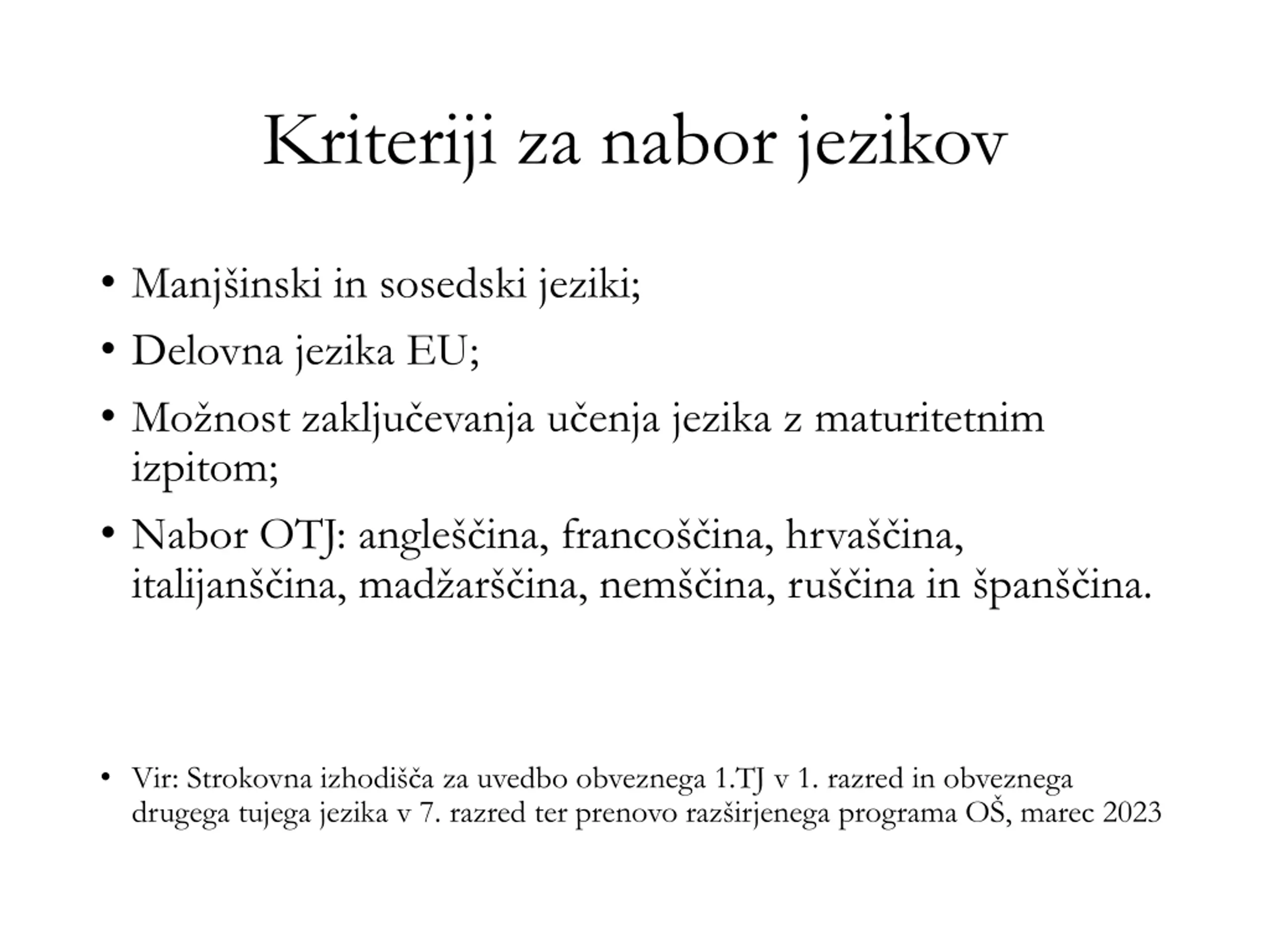 Kriteriji za nabor jezikov Manj inski in sosedski jeziki; Delovna jezika EU; Mo nost zaklju evanja u enja jezika z maturitetnim izpitom; Nabor OTJ: angle ina, franco ina, hrva ina, italijan ina, mad ar ina, nem ina, ru ina in pan ina. Vir: Strokovna izhodi a za uvedbo obveznega 1.TJ v 1. razred in obveznega drugega tujega jezika v 7. razred ter prenovo raz irjenega programa O , marec 2023
