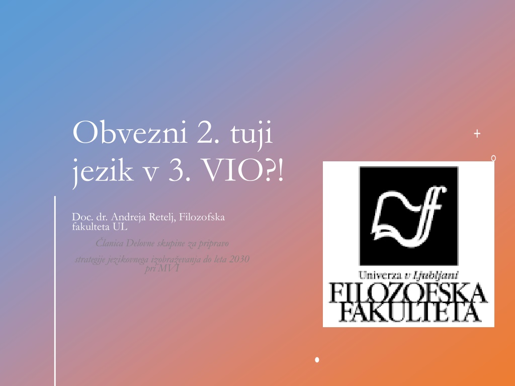 Obvezni 2. tuji jezik v 3. VIO?! Doc. dr. Andreja Retelj, Filozofska fakulteta UL lanica Delovne skupine za pripravo strategije jezikovnega izobra evanja do leta 2030 pri MVI