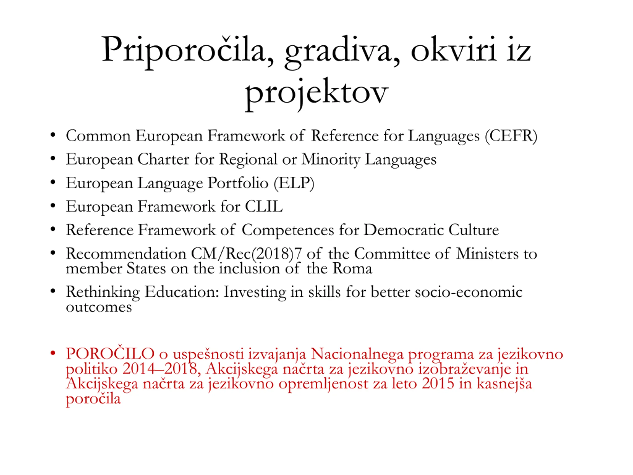 Priporoila, gradiva, okviri iz projektov Common European Framework of Reference for Languages (CEFR) European Charter for Regional or Minority Languages European Language Portfolio (ELP) European Framework for CLIL Reference Framework of Competences for Democratic Culture Recommendation CM/Rec(2018)7 of the Committee of Ministers to member States on the inclusion of the Roma Rethinking Education: Investing in skills for better socio-economic outcomes PORO ILO o uspe nosti izvajanja Nacionalnega programa za jezikovno politiko 2014 2018, Akcijskega na rta za jezikovno izobra evanje in Akcijskega na rta za jezikovno opremljenost za leto 2015 in kasnej a poro ila