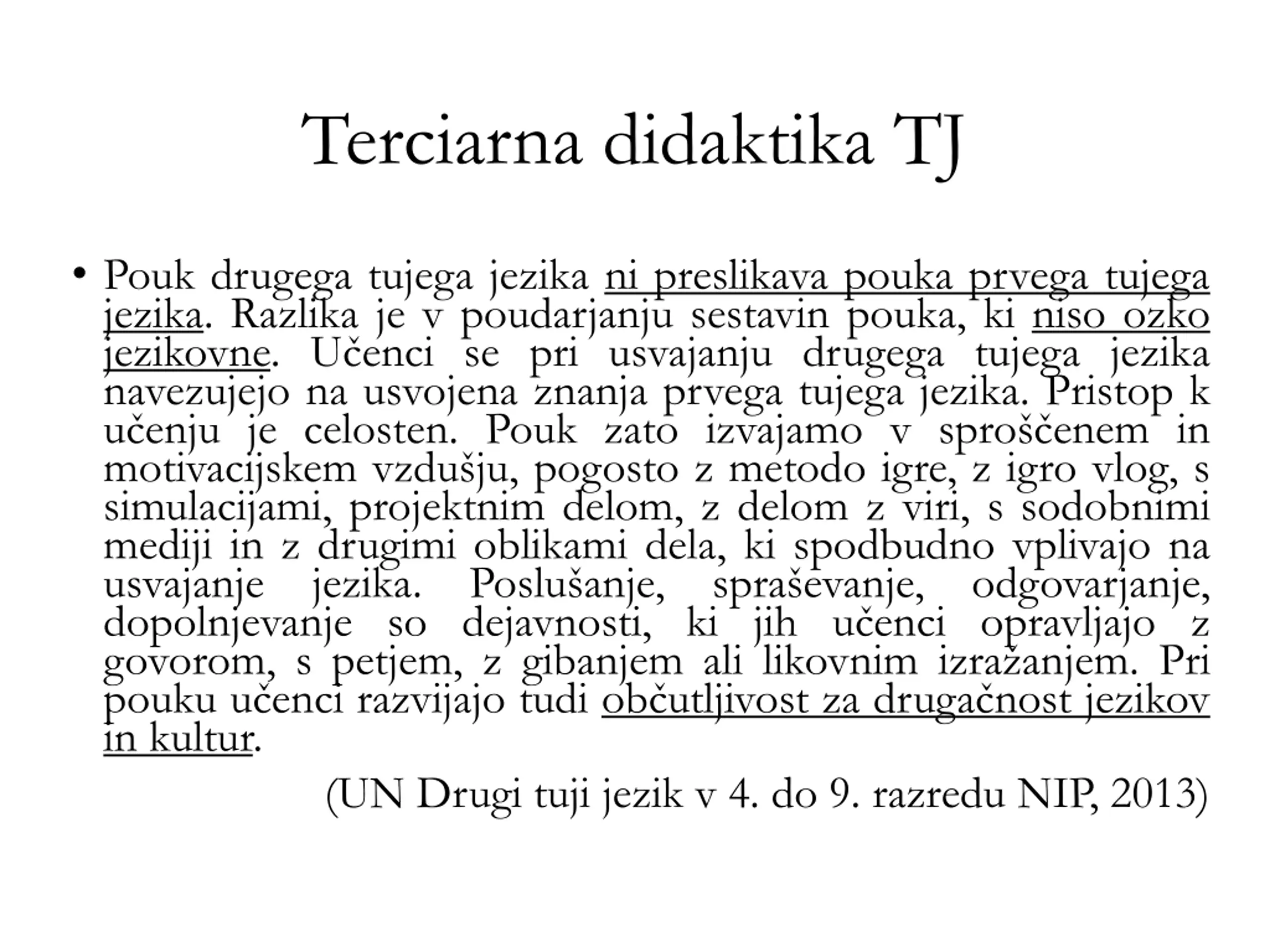 Terciarna didaktika TJ Pouk drugega tujega jezika ni preslikava pouka prvega tujega jezika. Razlika je v poudarjanju sestavin pouka, ki niso ozko jezikovne. U enci se pri usvajanju drugega tujega jezika navezujejo na usvojena znanja prvega tujega jezika. Pristop k u enju je celosten. Pouk zato izvajamo v spro enem in motivacijskem vzdu ju, pogosto z metodo igre, z igro vlog, s simulacijami, projektnim delom, z delom z viri, s sodobnimi mediji in z drugimi oblikami dela, ki spodbudno vplivajo na usvajanje jezika. Poslu anje,spra evanje, odgovarjanje, dopolnjevanje so dejavnosti, ki jih u enci opravljajo z govorom, s petjem, z gibanjem ali likovnim izra anjem. Pri pouku u enci razvijajo tudi ob utljivost za druga nost jezikov in kultur. (UN Drugi tuji jezik v 4. do 9. razredu NIP, 2013)