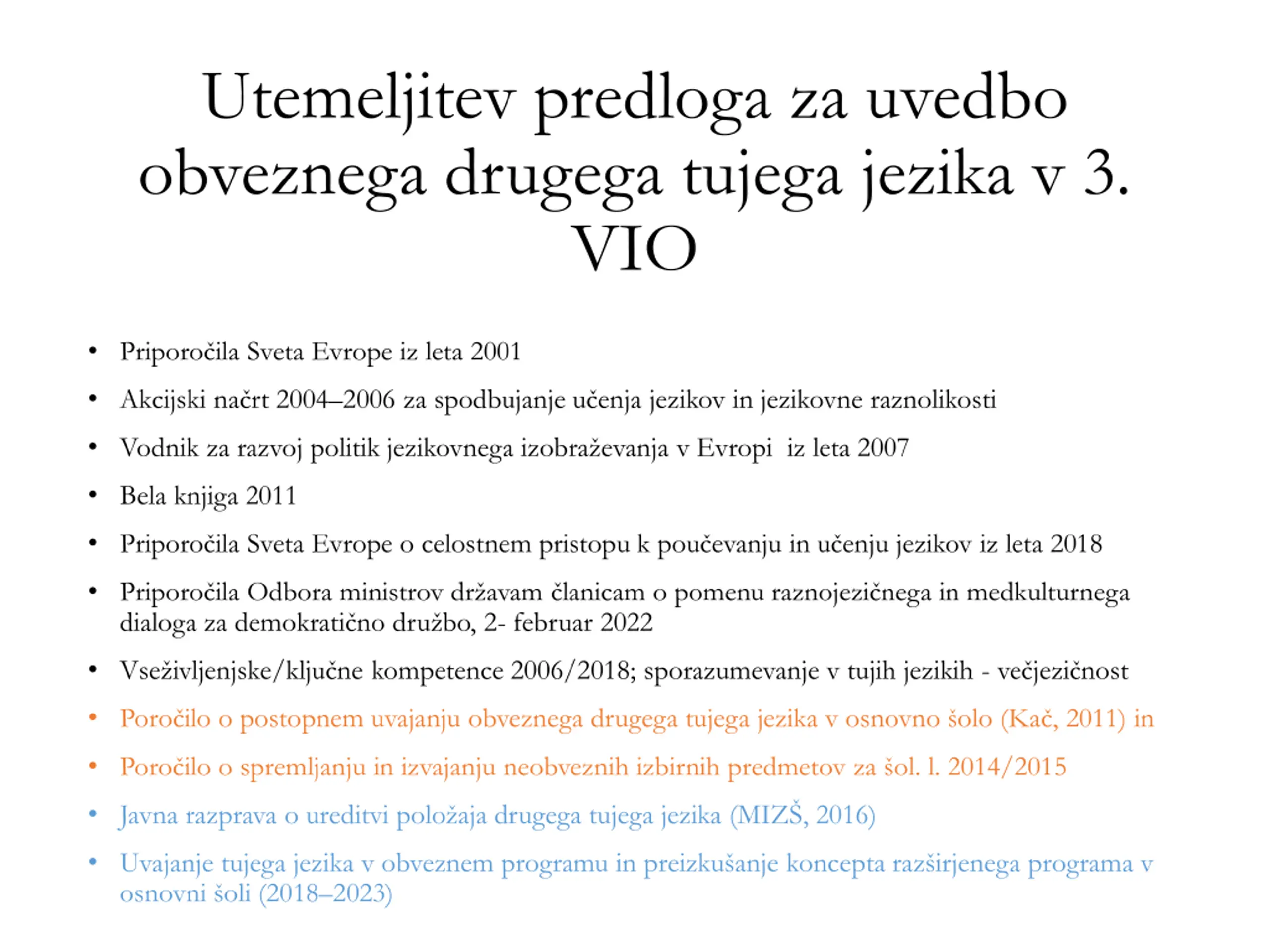 Utemeljitev predloga za uvedbo obveznega drugega tujega jezika v 3. VIO Priporo ila Sveta Evrope iz leta 2001 Akcijski na rt 2004 2006 za spodbujanje u enja jezikov in jezikovne raznolikosti Vodnik za razvoj politik jezikovnega izobra evanja v Evropi iz leta 2007 Bela knjiga 2011 Priporo ila Sveta Evrope o celostnem pristopu k pou evanju in u enju jezikov iz leta 2018 Priporo ila Odbora ministrov dr avam lanicam o pomenu raznojezi nega in medkulturnega dialoga za demokrati no dru bo, 2- februar 2022 Vse ivljenjske/klju ne kompetence 2006/2018; sporazumevanje v tujih jezikih - ve jezi nost Poro ilo o postopnem uvajanju obveznega drugega tujega jezika v osnovno olo (Ka , 2011) in Poro ilo o spremljanju in izvajanju neobveznih izbirnih predmetov za ol. l. 2014/2015 Javna razprava o ureditvi polo aja drugega tujega jezika (MIZ , 2016) Uvajanje tujega jezika v obveznem programu in preizku anje koncepta raz irjenega programa v osnovni oli (2018 2023)