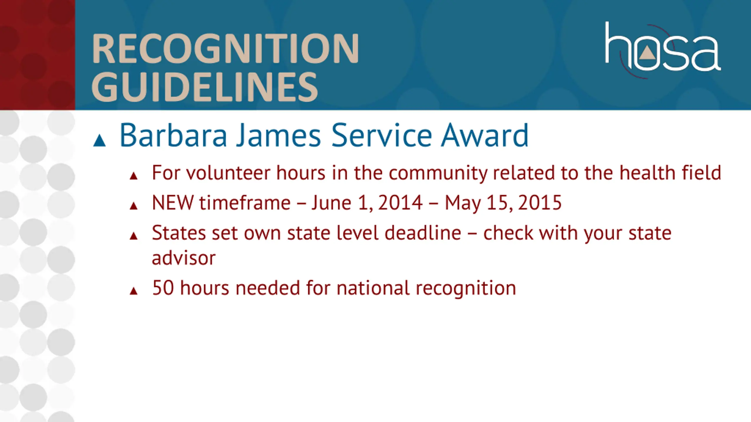 RECOGNITION GUIDELINES Barbara James Service Award For volunteer hours in the community related to the health field NEW timeframe June 1, 2014 May 15, 2015 States set own state level deadline check with your state advisor 50 hours needed for national recognition