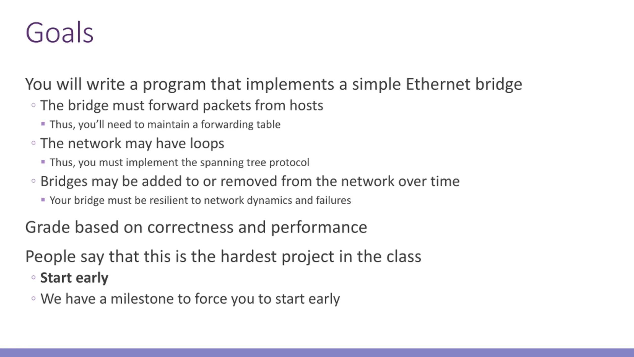Goals You will write a program that implements a simple Ethernet bridge The bridge must forward packets from hosts Thus, you ll need to maintain a forwarding table The network may have loops Thus, you must implement the spanning tree protocol Bridges may be added to or removed from the network over time Your bridge must be resilient to network dynamics and failures Grade based on correctness and performance People say that this is the hardest project in the class Start early We have a milestone to force you to start early