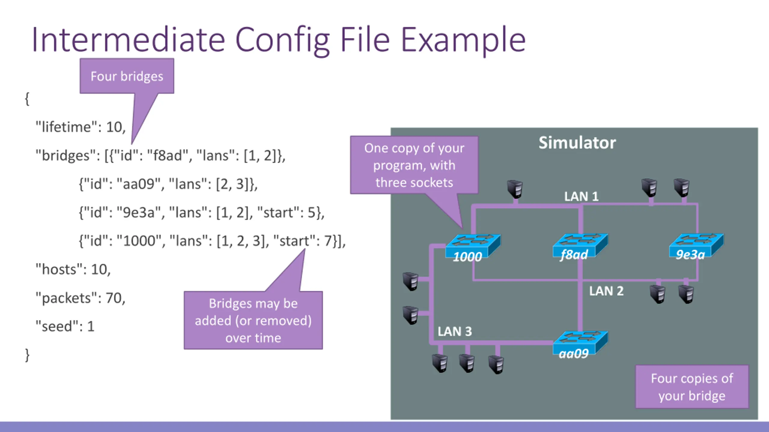 Simple Config File Example One bridge, connected to one LAN { "lifetime": 4, Simulator "bridges": [{"id": "08ad", "lans": [1]}], "hosts": 2, Two hosts "packets": 10, One copy of your program, with one socket "seed": 1 }