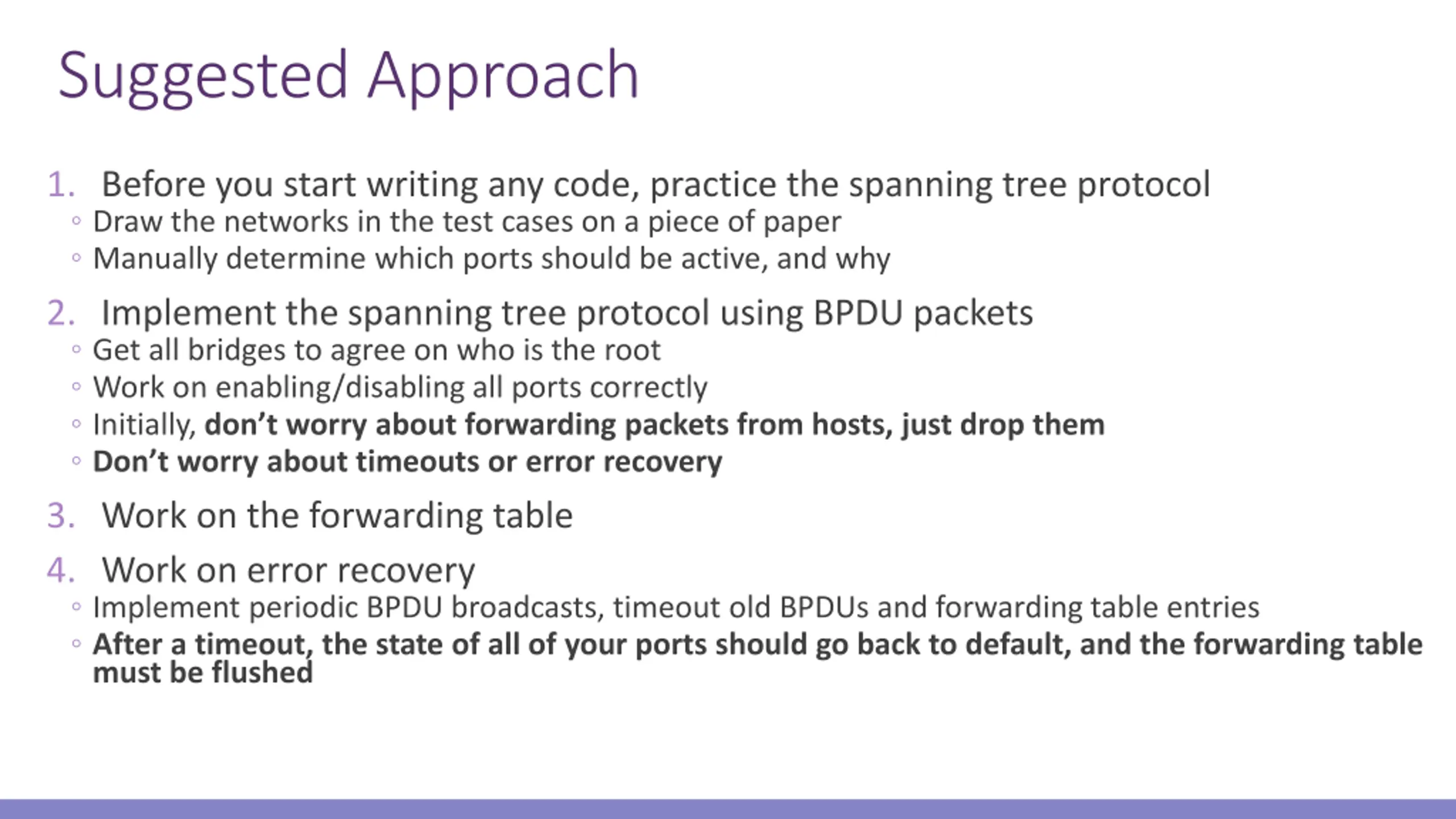 Suggested Approach 1. Before you start writing any code, practice the spanning tree protocol Draw the networks in the test cases on a piece of paper Manually determine which ports should be active, and why 2. Implement the spanning tree protocol using BPDU packets Get all bridges to agree on who is the root Work on enabling/disabling all ports correctly Initially, don t worry about forwarding packets from hosts, just drop them Don t worry about timeouts or error recovery 3. Work on the forwarding table 4. Work on error recovery Implement periodic BPDU broadcasts, timeout old BPDUs and forwarding table entries After a timeout, the state of all of your ports should go back to default, and the forwarding table must be flushed