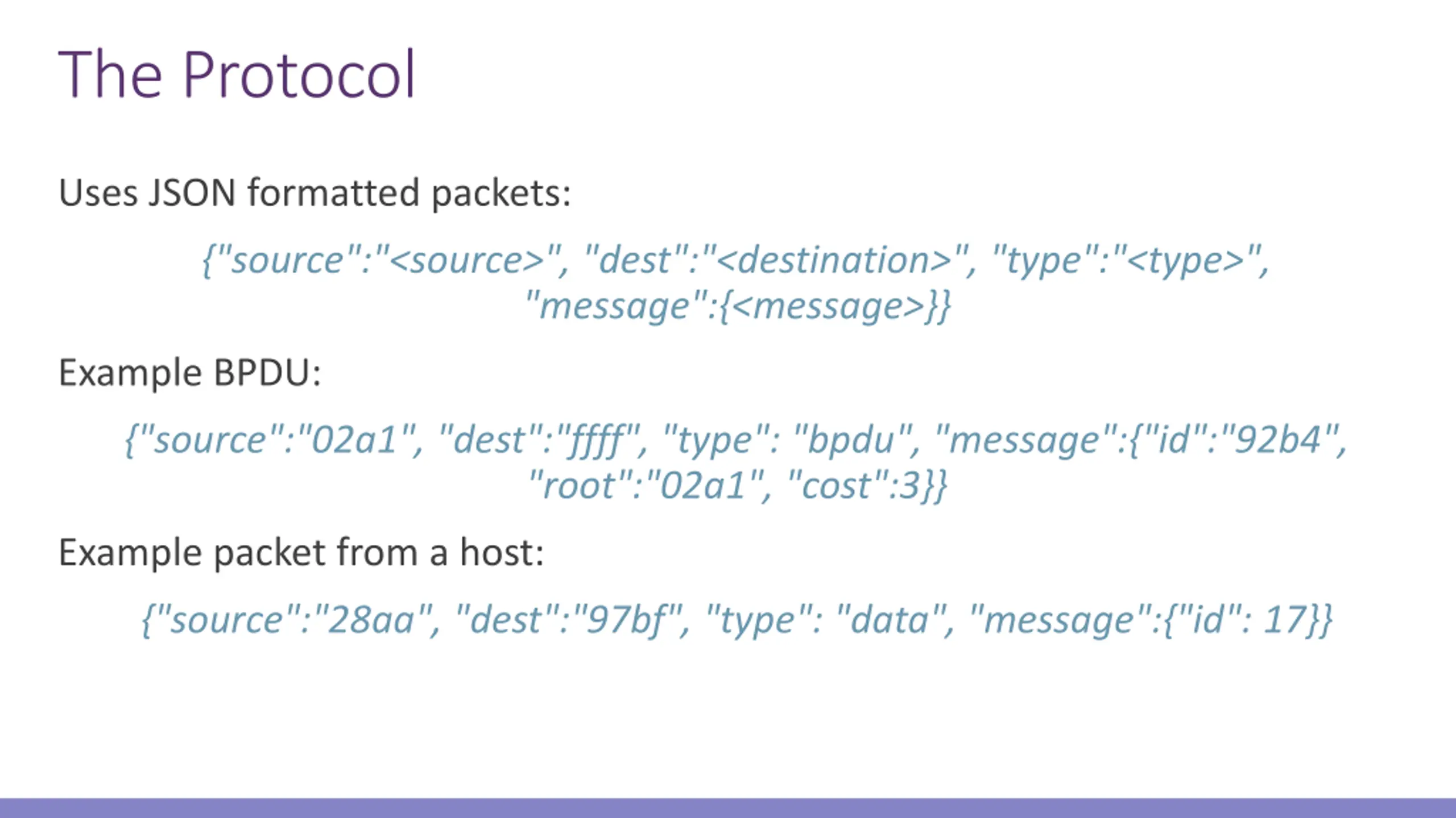 The Protocol Uses JSON formatted packets: {"source":"<source>", "dest":"<destination>", "type":"<type>", "message":{<message>}} Example BPDU: {"source":"02a1", "dest":"ffff", "type": "bpdu", "message":{"id":"92b4", "root":"02a1", "cost":3}} Example packet from a host: {"source":"28aa", "dest":"97bf", "type": "data", "message":{"id": 17}}