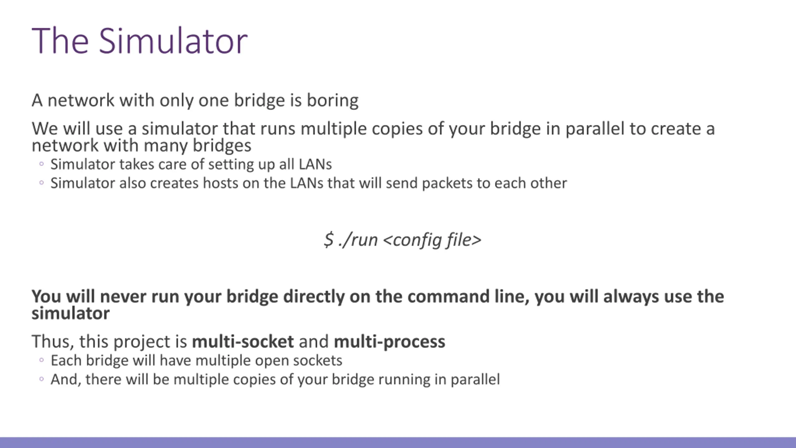 The Simulator A network with only one bridge is boring We will use a simulator that runs multiple copies of your bridge in parallel to create a network with many bridges Simulator takes care of setting up all LANs Simulator also creates hosts on the LANs that will send packets to each other $ ./run <config file> You will never run your bridge directly on the command line, you will always use the simulator Thus, this project is multi-socket and multi-process Each bridge will have multiple open sockets And, there will be multiple copies of your bridge running in parallel