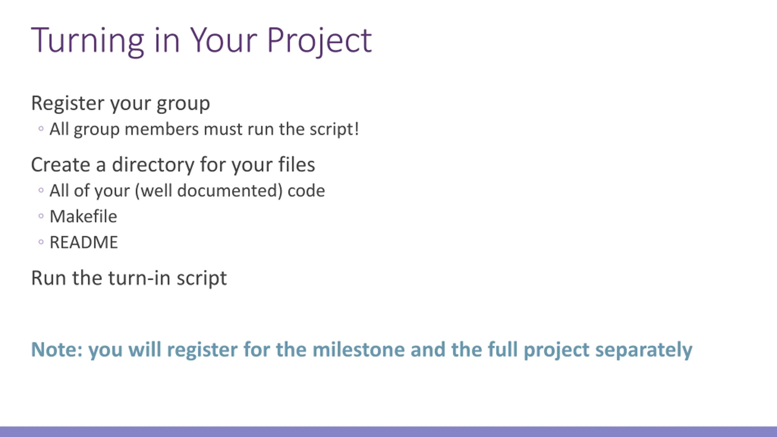 Turning in Your Project Register your group All group members must run the script! Create a directory for your files All of your (well documented) code Makefile README Run the turn-in script Note: you will register for the milestone and the full project separately