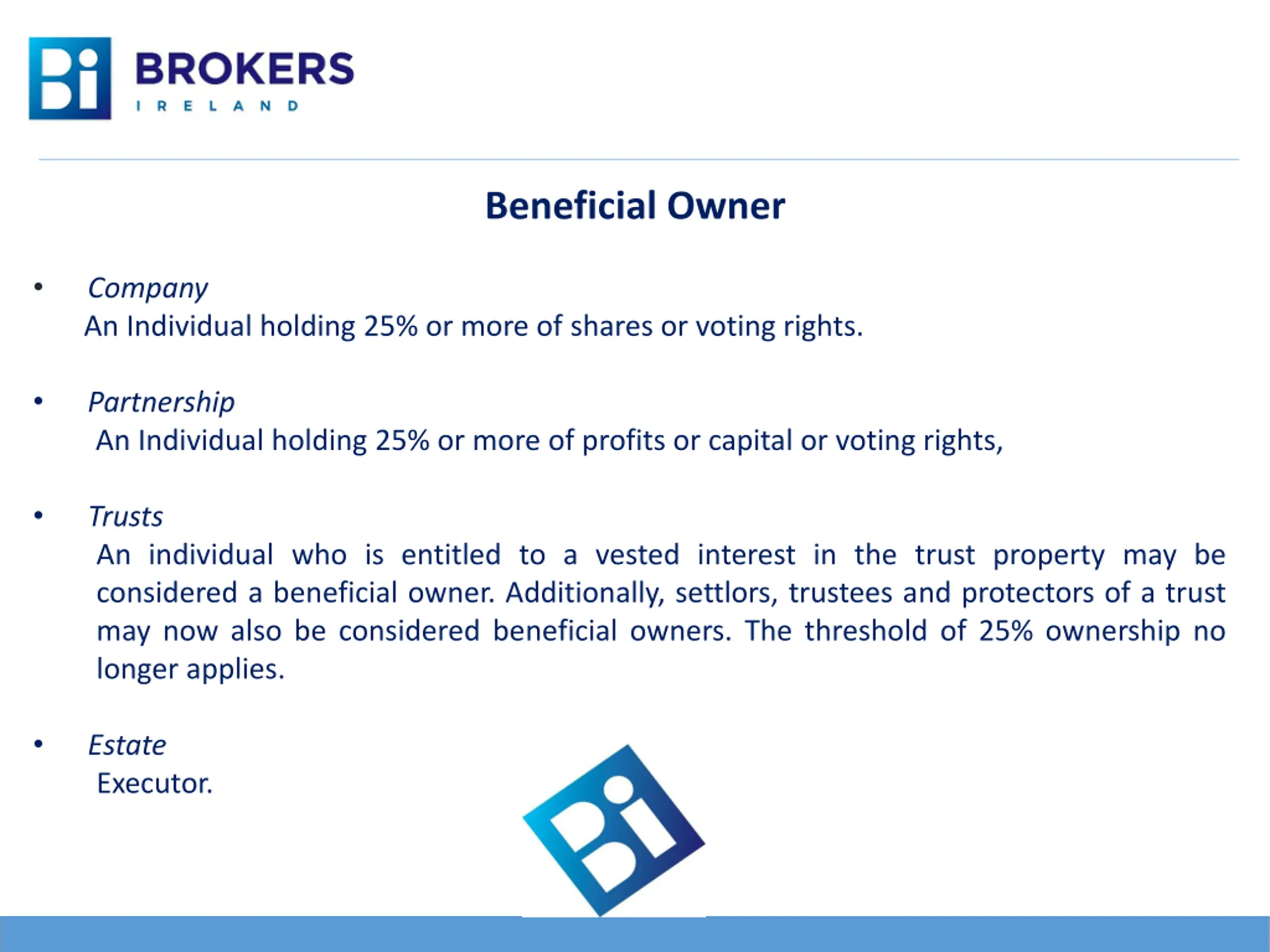 Beneficial Owner An Individual holding 25% or more of shares or voting rights. Company Partnership An Individual holding 25% or more of profits or capital or voting rights, Trusts An individual who is entitled to a vested interest in the trust property may be considered a beneficial owner. Additionally, settlors, trustees and protectors of a trust may now also be considered beneficial owners. The threshold of 25% ownership no longer applies. Estate Executor.