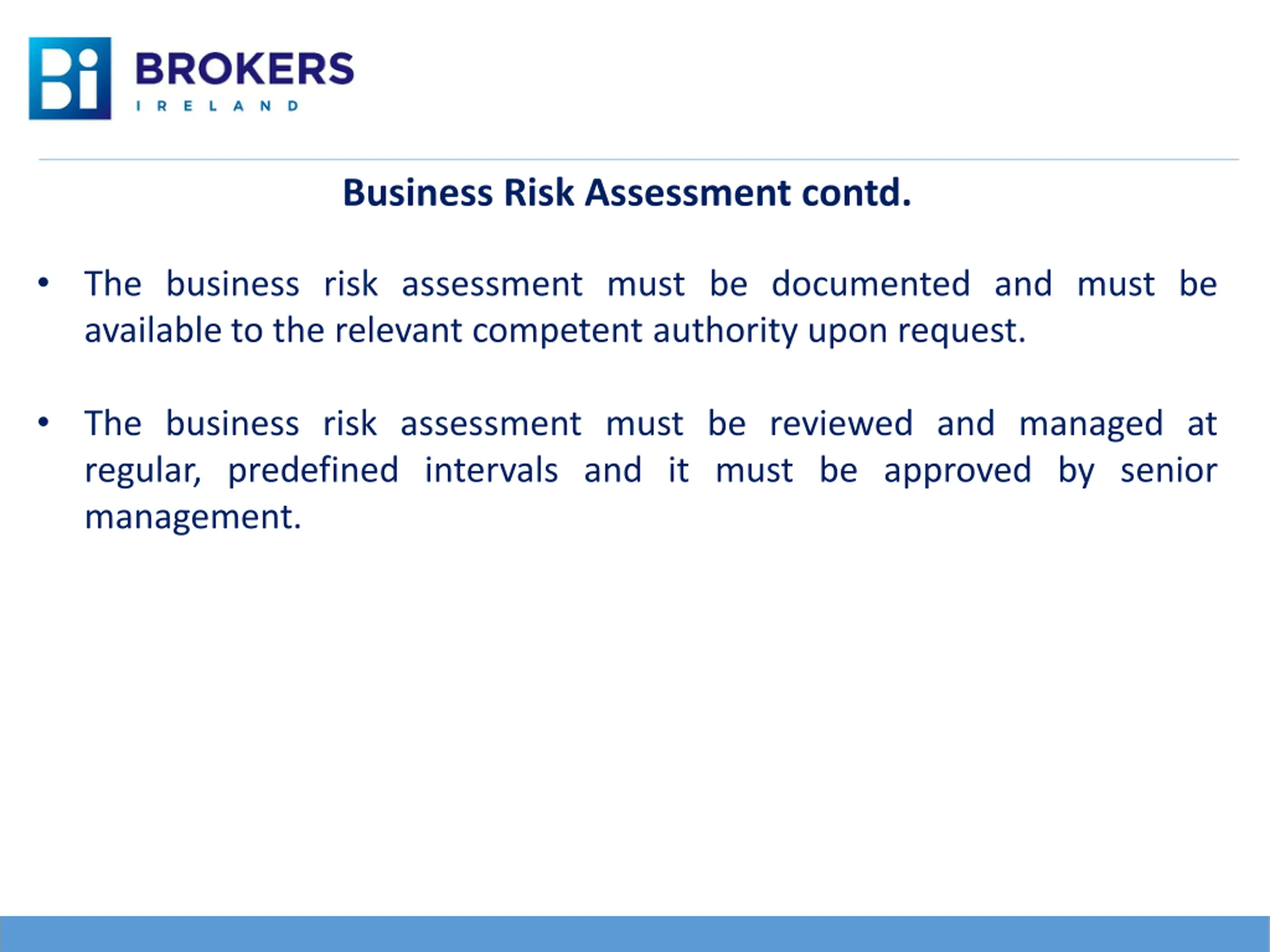 Business Risk Assessment contd. The business risk assessment must be documented and must be available to the relevant competent authority upon request. The business risk assessment must be reviewed and managed at regular, predefined intervals and it must be approved by senior management.