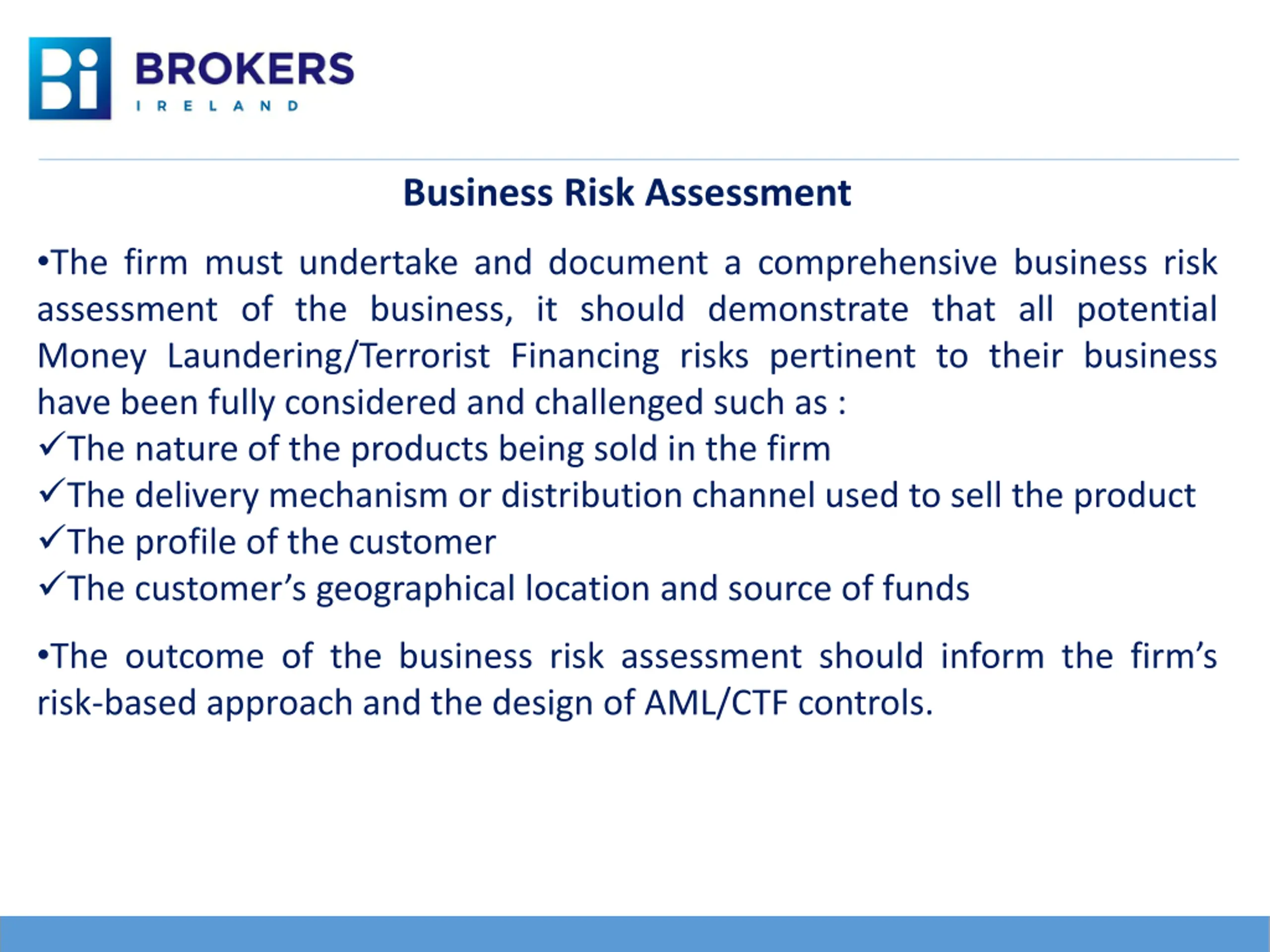 Business Risk Assessment The firm must undertake and document a comprehensive business risk assessment of the business, it should demonstrate that all potential Money Laundering/Terrorist Financing risks pertinent to their business have been fully considered and challenged such as : The nature of the products being sold in the firm The delivery mechanism or distribution channel used to sell the product The profile of the customer The customer s geographical location and source of funds The outcome of the business risk assessment should inform the firm s risk-based approach and the design of AML/CTF controls.