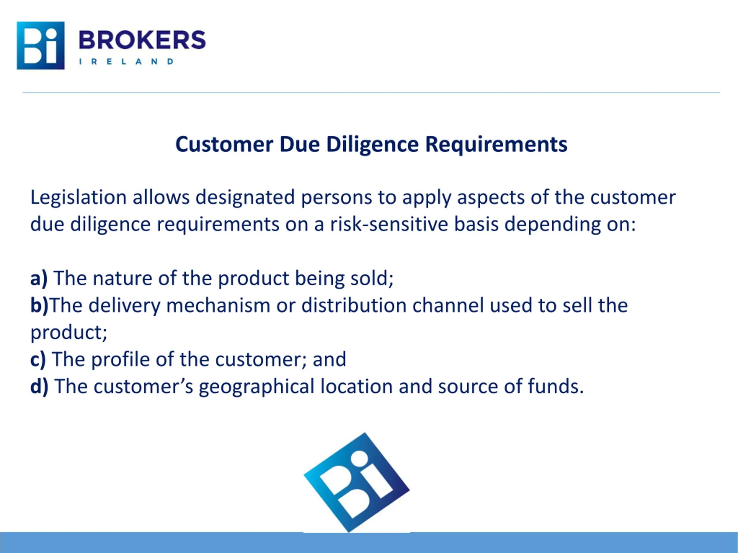 Customer Due Diligence Requirements Legislation allows designated persons to apply aspects of the customer due diligence requirements on a risk-sensitive basis depending on: a) The nature of the product being sold; b)The delivery mechanism or distribution channel used to sell the product; c) The profile of the customer; and d)The customer s geographical location and source of funds.