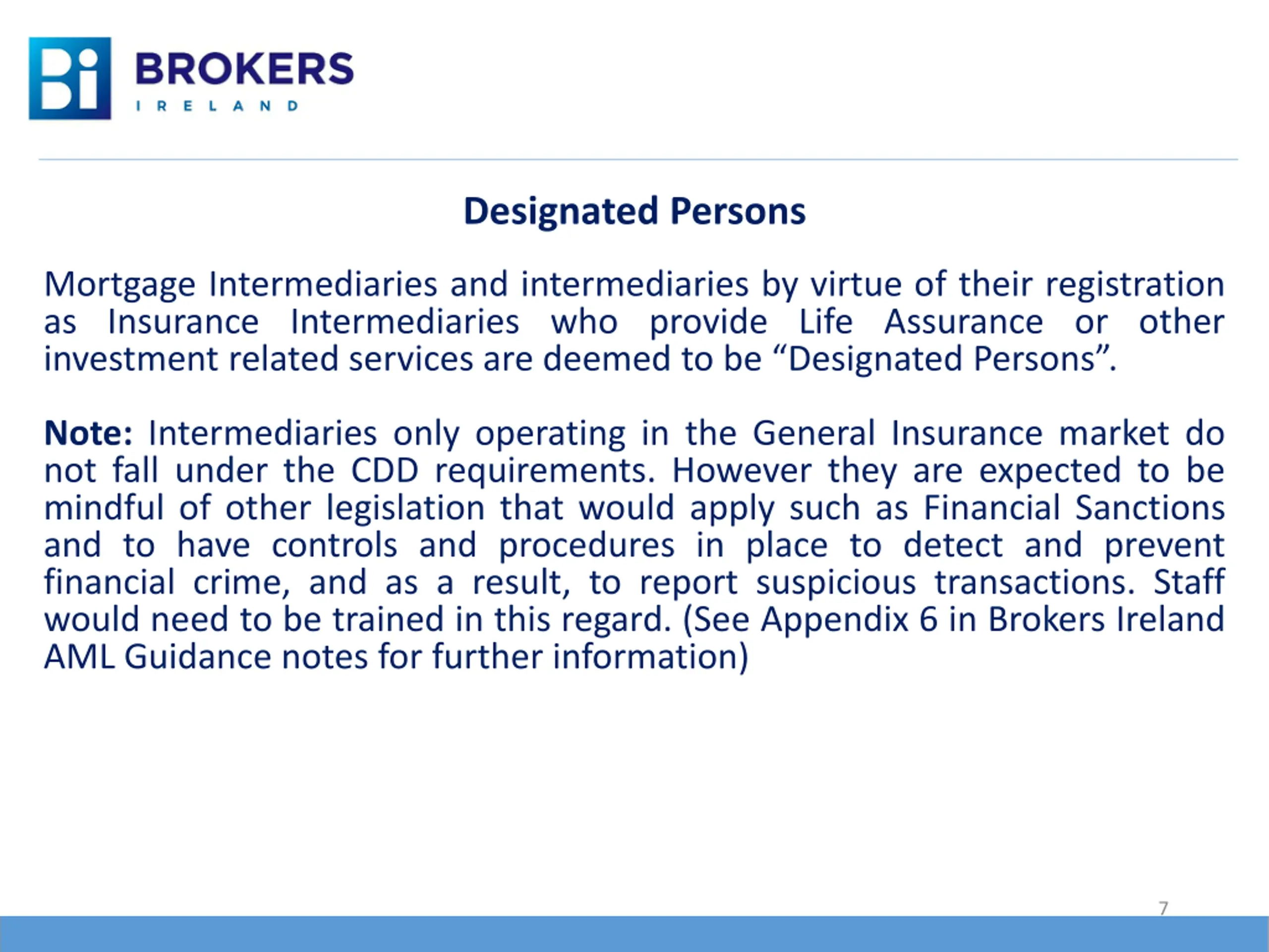 Designated Persons Mortgage Intermediaries and intermediaries by virtue of their registration as Insurance Intermediaries who provide Life Assurance or other investment related services are deemed to be DesignatedPersons . Note: Intermediaries only operating in the General Insurance market do not fall under the CDD requirements. However they are expected to be mindful of other legislation that would apply such as Financial Sanctions and to have controls and procedures in place to detect and prevent financial crime, and as a result, to report suspicious transactions. Staff would need to be trained in this regard. (See Appendix 6 in Brokers Ireland AML Guidance notes for further information) 7
