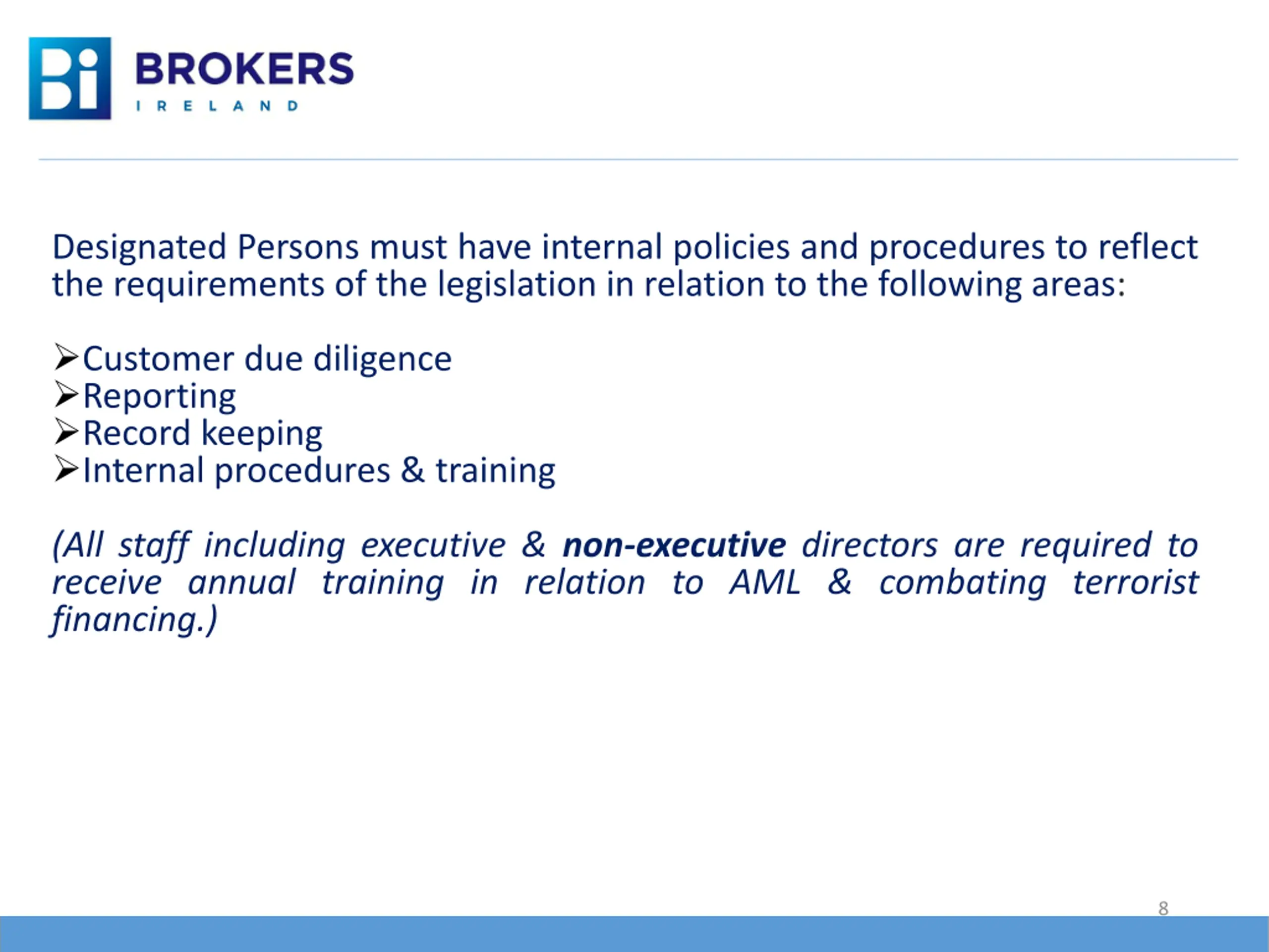 Designated Persons must have internal policies and procedures to reflect the requirements of the legislation in relation to the following areas: Customer due diligence Reporting Record keeping Internal procedures & training (All staff including executive & non-executive directors are required to receive annual training in relation to AML & combating terrorist financing.) 8