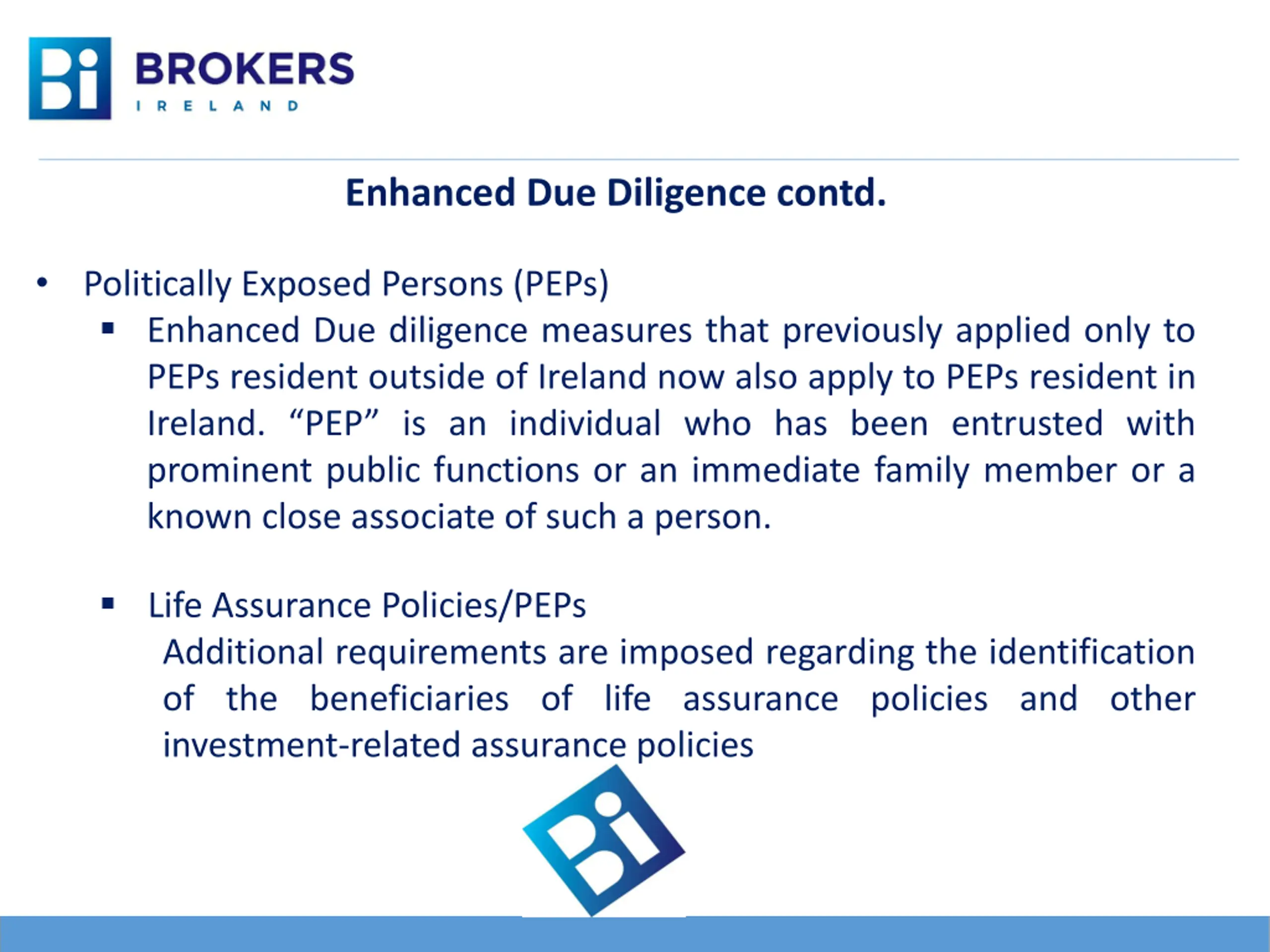 Enhanced Due Diligence contd. Politically Exposed Persons (PEPs) Enhanced Due diligence measures that previously applied only to PEPs resident outside of Ireland now also apply to PEPs resident in Ireland. PEP is an individual who has been entrusted with prominent public functions or an immediate family member or a known close associate of such a person. Life Assurance Policies/PEPs Additional requirements are imposed regarding the identification of the beneficiaries of life assurance policies and other investment-related assurance policies