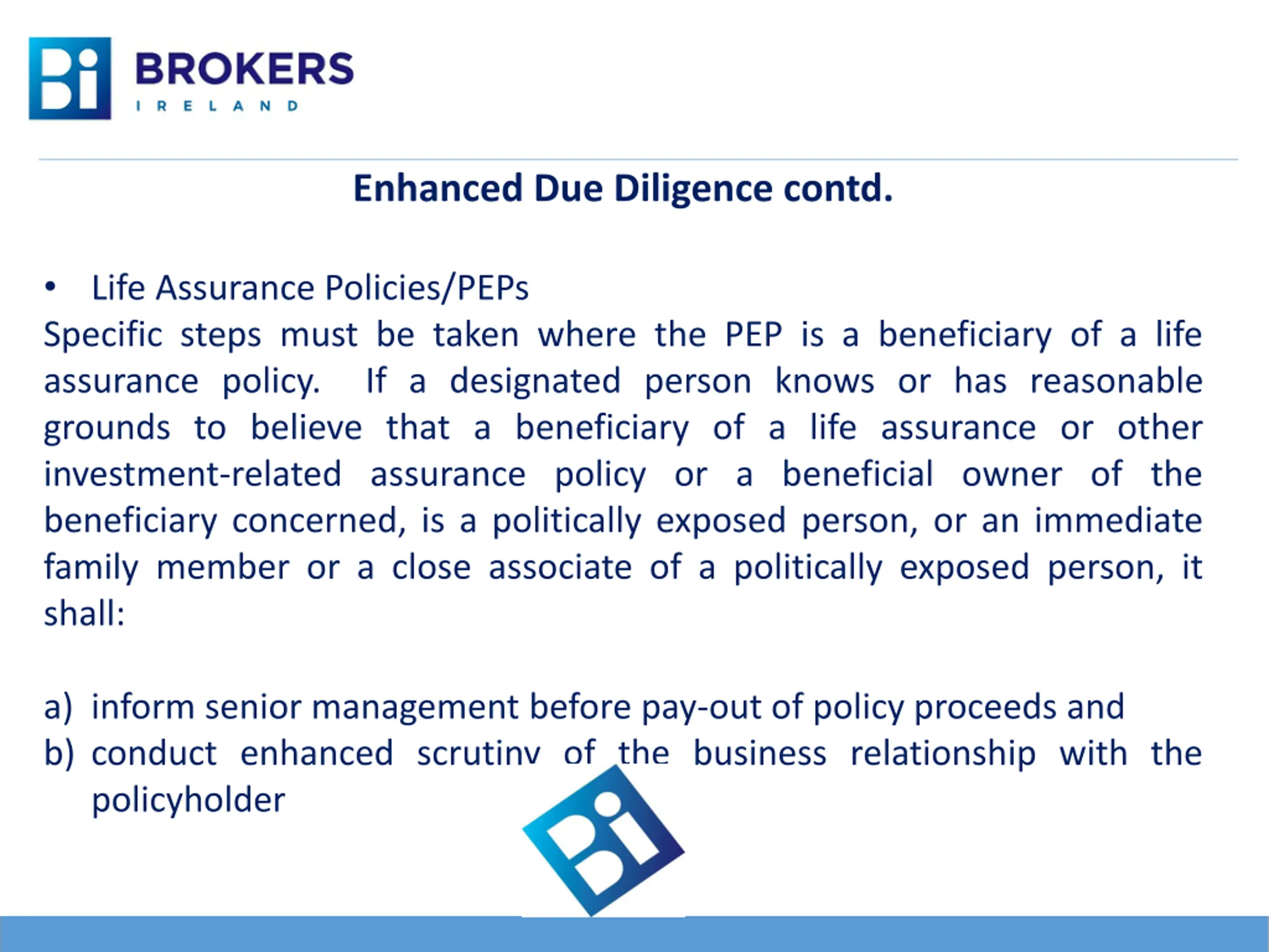 Enhanced Due Diligence contd. Life Assurance Policies/PEPs Specific steps must be taken where the PEP is a beneficiary of a life assurance policy. If a designated person knows or has reasonable grounds to believe that a beneficiary of a life assurance or other investment-related assurance policy or a beneficial owner of the beneficiary concerned, is a politically exposed person, or an immediate family member or a close associate of a politically exposed person, it shall: a) inform senior management before pay-out of policy proceeds and b) conduct enhanced scrutiny of the business relationship with the policyholder
