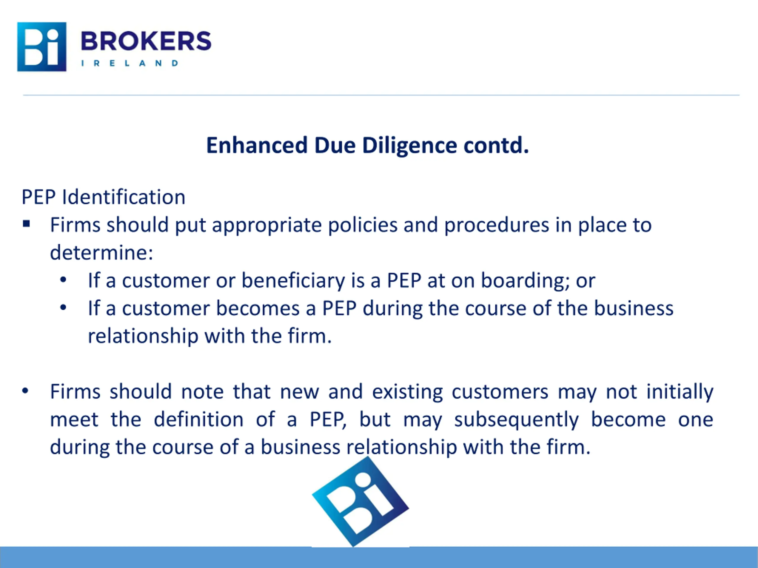 Enhanced Due Diligence contd. PEP Identification Firms should put appropriate policies and procedures in place to determine: If a customer or beneficiary is a PEP at on boarding; or If a customer becomes a PEP during the course of the business relationship with the firm. Firms should note that new and existing customers may not initially meet the definition of a PEP, but may subsequently become one during the course of a business relationship with the firm.