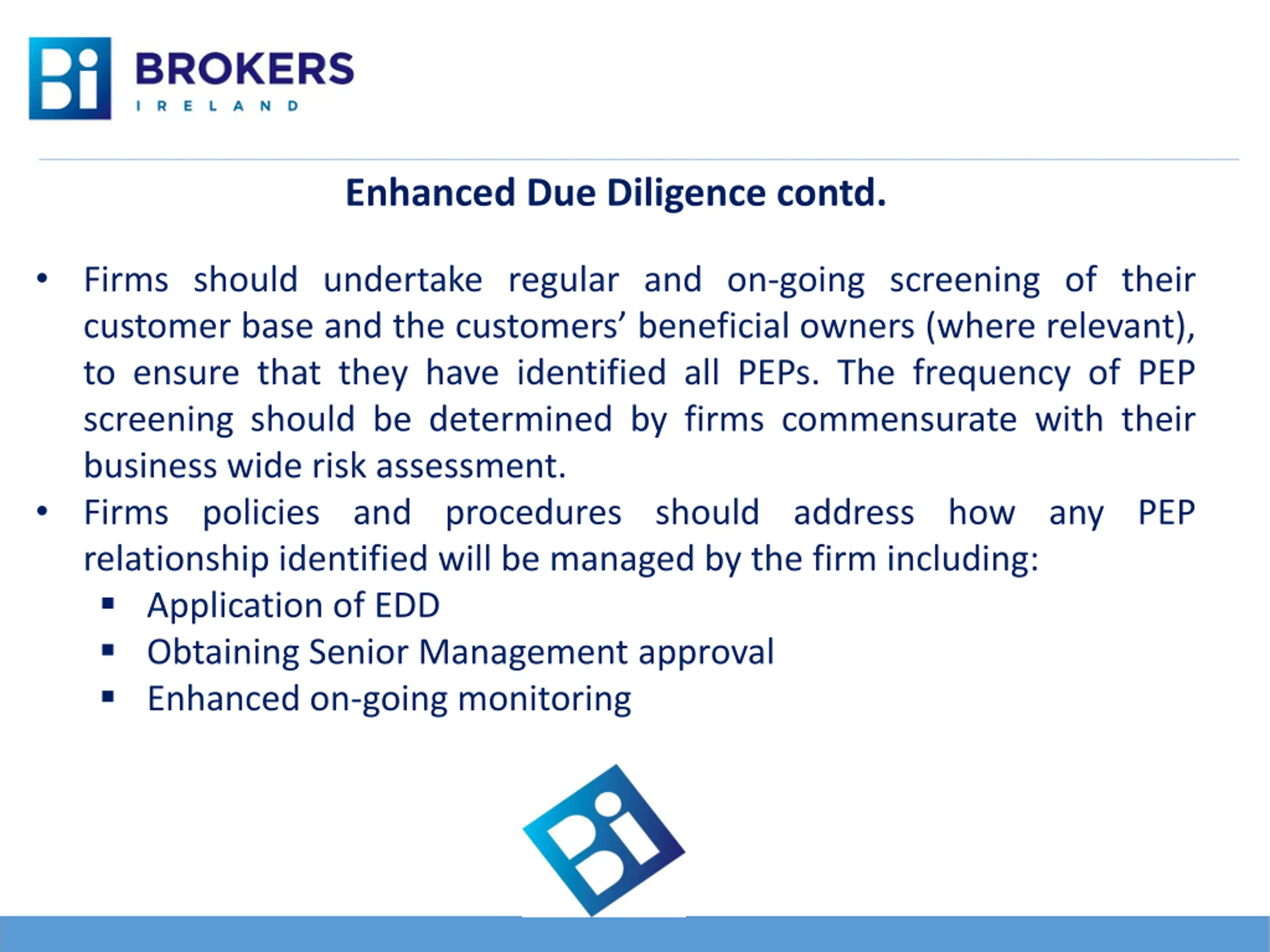 Enhanced Due Diligence contd. Firms should undertake regular and on-going screening of their customer base and the customers beneficial owners (where relevant), to ensure that they have identified all PEPs. The frequency of PEP screening should be determined by firms commensurate with their business wide risk assessment. Firms policies and procedures should address how any PEP relationship identified will be managed by the firm including: Application of EDD Obtaining Senior Management approval Enhanced on-going monitoring