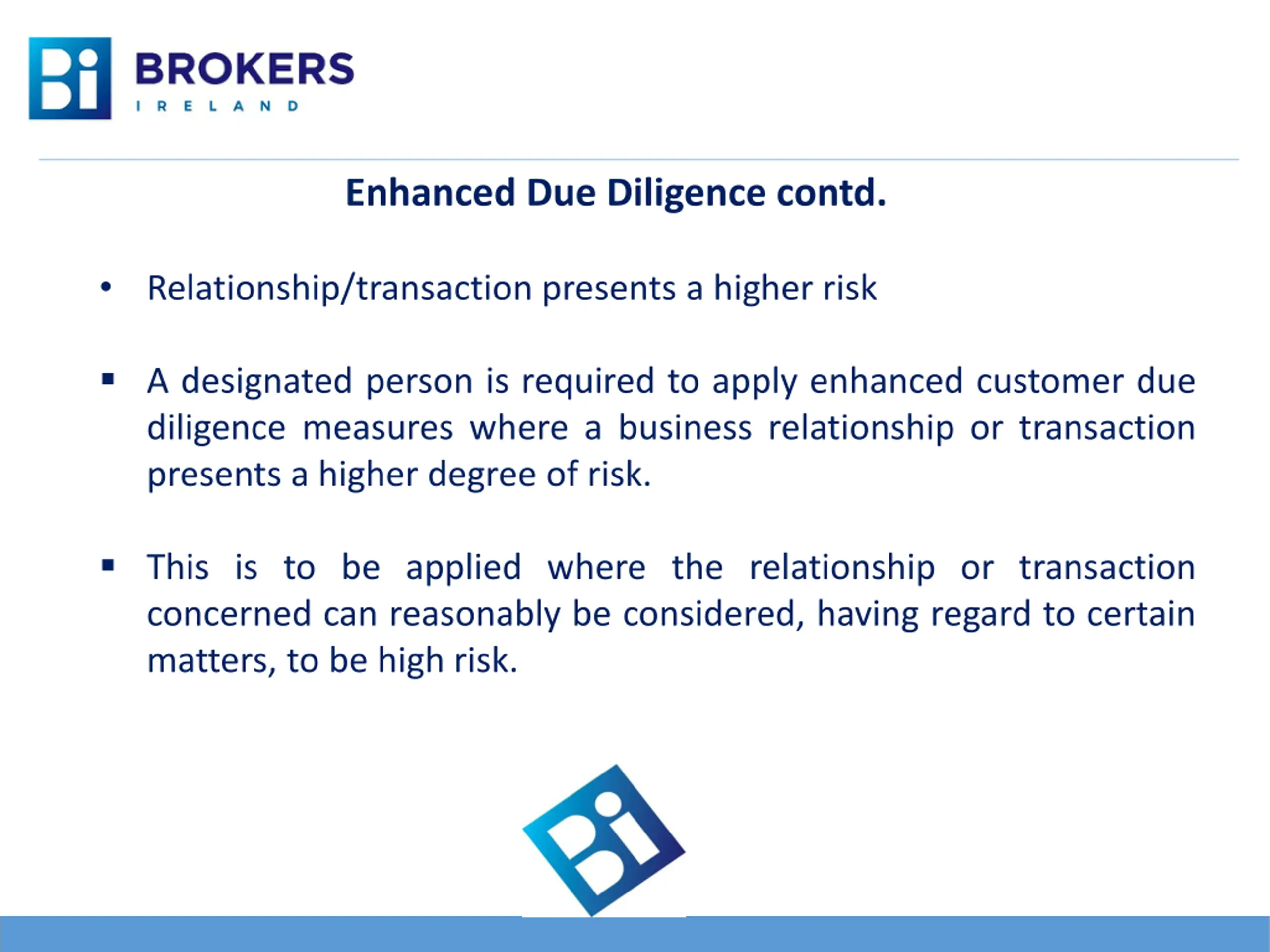 Enhanced Due Diligence contd. Relationship/transaction presents a higher risk A designated person is required to apply enhanced customer due diligence measures where a business relationship or transaction presents a higher degree of risk. This is to be applied where the relationship or transaction concerned can reasonably be considered, having regard to certain matters, to be high risk.