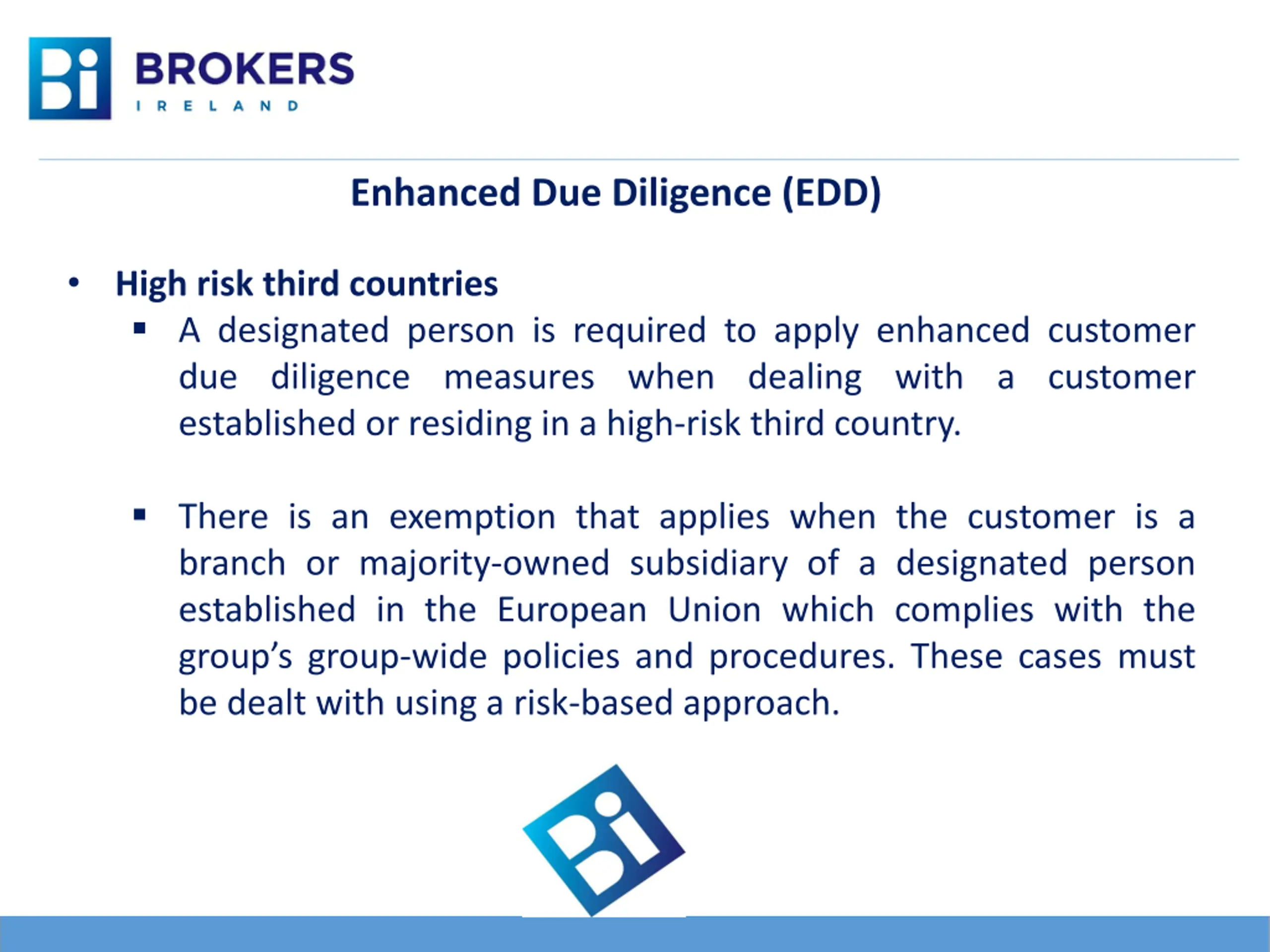 Enhanced Due Diligence (EDD) High risk third countries A designated person is required to apply enhanced customer due diligence measures when dealing with a customer established or residing in a high-risk third country. There is an exemption that applies when the customer is a branch or majority-owned subsidiary of a designated person established in the European Union which complies with the group s group-wide policies and procedures. These cases must be dealt with using a risk-based approach.
