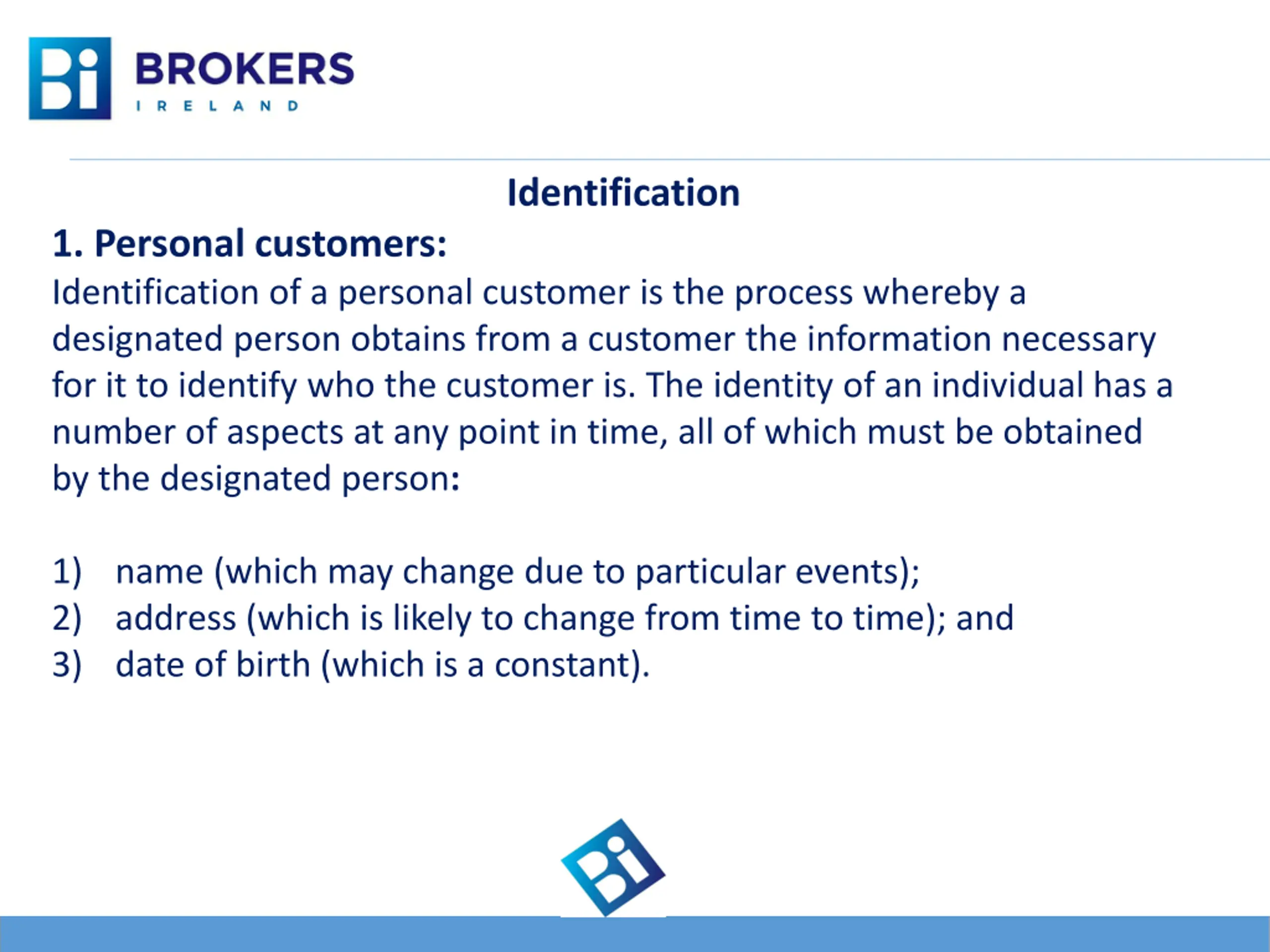Identification 1. Personal customers: Identification of a personal customer is the process whereby a designated person obtains from a customer the information necessary for it to identify who the customer is. The identity of an individual has a number of aspects at any point in time, all of which must be obtained by the designated person: 1) name (which may change due to particular events); 2) address (which is likely to change from time to time); and 3) date of birth (which is a constant).
