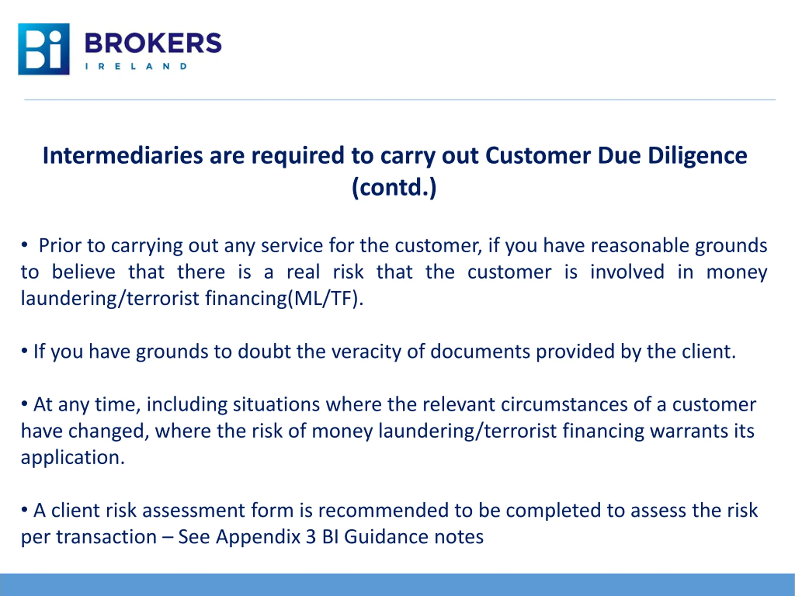 Intermediaries are required to carry out Customer Due Diligence (contd.) Prior to carrying out any service for the customer, if you have reasonable grounds to believe that there is a real risk that the customer is involved in money laundering/terrorist financing(ML/TF). If you have grounds to doubt the veracity of documents provided by the client. At any time, including situations where the relevant circumstances of a customer have changed, where the risk of money laundering/terrorist financing warrants its application. A client risk assessment form is recommended to be completed to assess the risk per transaction See Appendix 3 BI Guidance notes