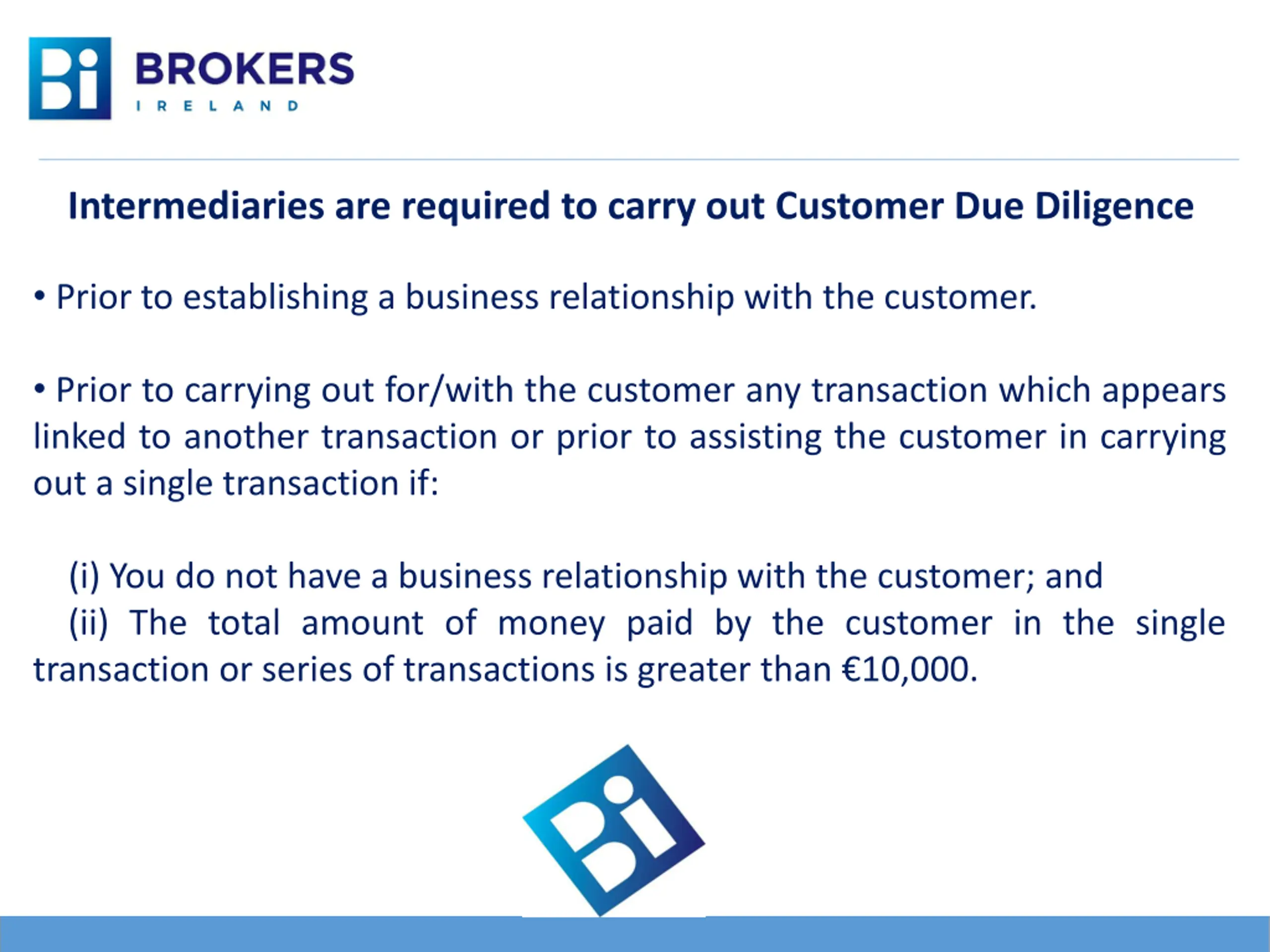 Intermediaries are required to carry out Customer Due Diligence Prior to establishing a business relationship with the customer. Prior to carrying out for/with the customer any transaction which appears linked to another transaction or prior to assisting the customer in carrying out a single transaction if: (i) You do not have a business relationship with the customer; and (ii) The total amount of money paid by the customer in the single transaction or series of transactions is greater than 10,000.