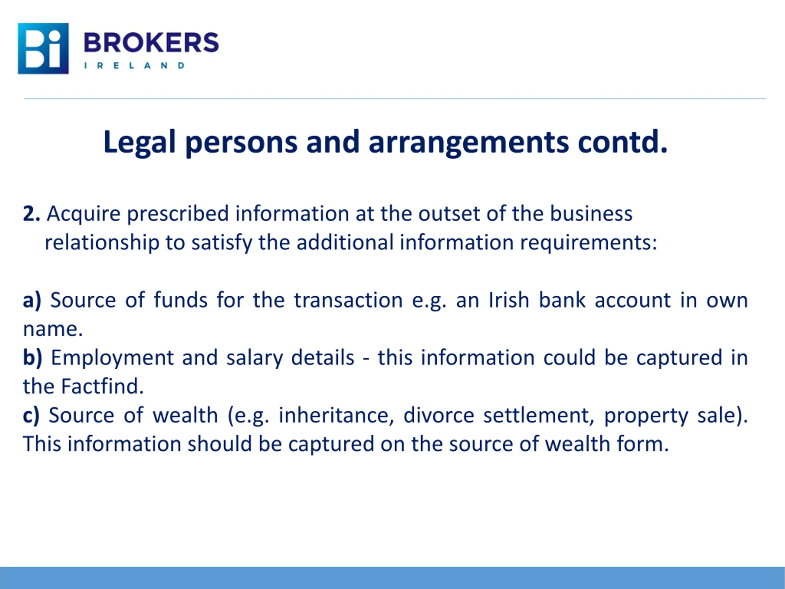 Legal persons and arrangements contd. 2. Acquire prescribed information at the outset of the business relationship to satisfy the additional information requirements: a) Source of funds for the transaction e.g. an Irish bank account in own name. b) Employment and salary details - this information could be captured in the Factfind. c) Source of wealth (e.g. inheritance, divorce settlement, property sale). This information should be captured on the source of wealth form.