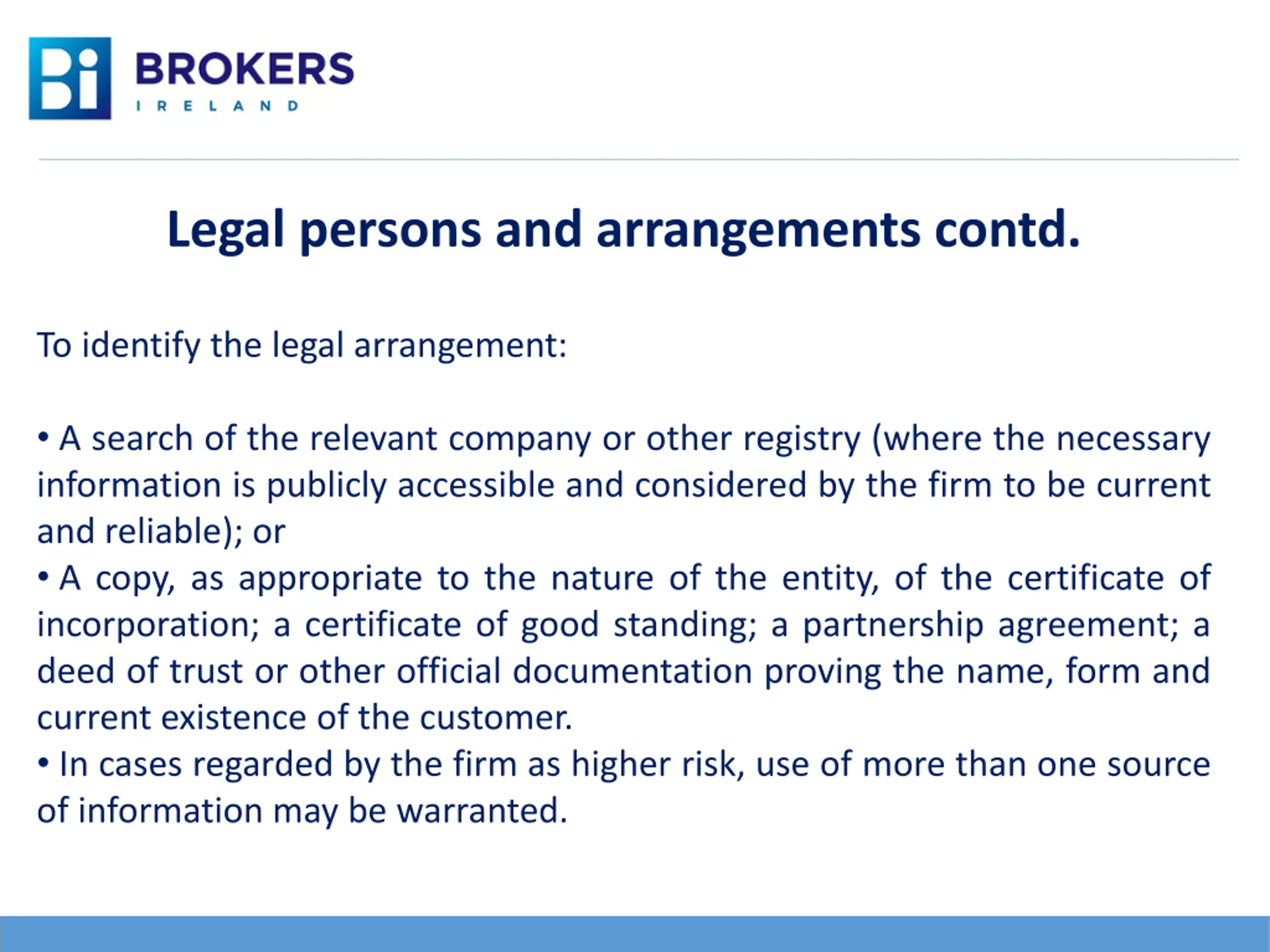 Legal persons and arrangements contd. To identify the legal arrangement: A search of the relevant company or other registry (where the necessary information is publicly accessible and considered by the firm to be current and reliable); or A copy, as appropriate to the nature of the entity, of the certificate of incorporation; a certificate of good standing; a partnership agreement; a deed of trust or other official documentation proving the name, form and current existence of the customer. In cases regarded by the firm as higher risk, use of more than one source of information may be warranted.