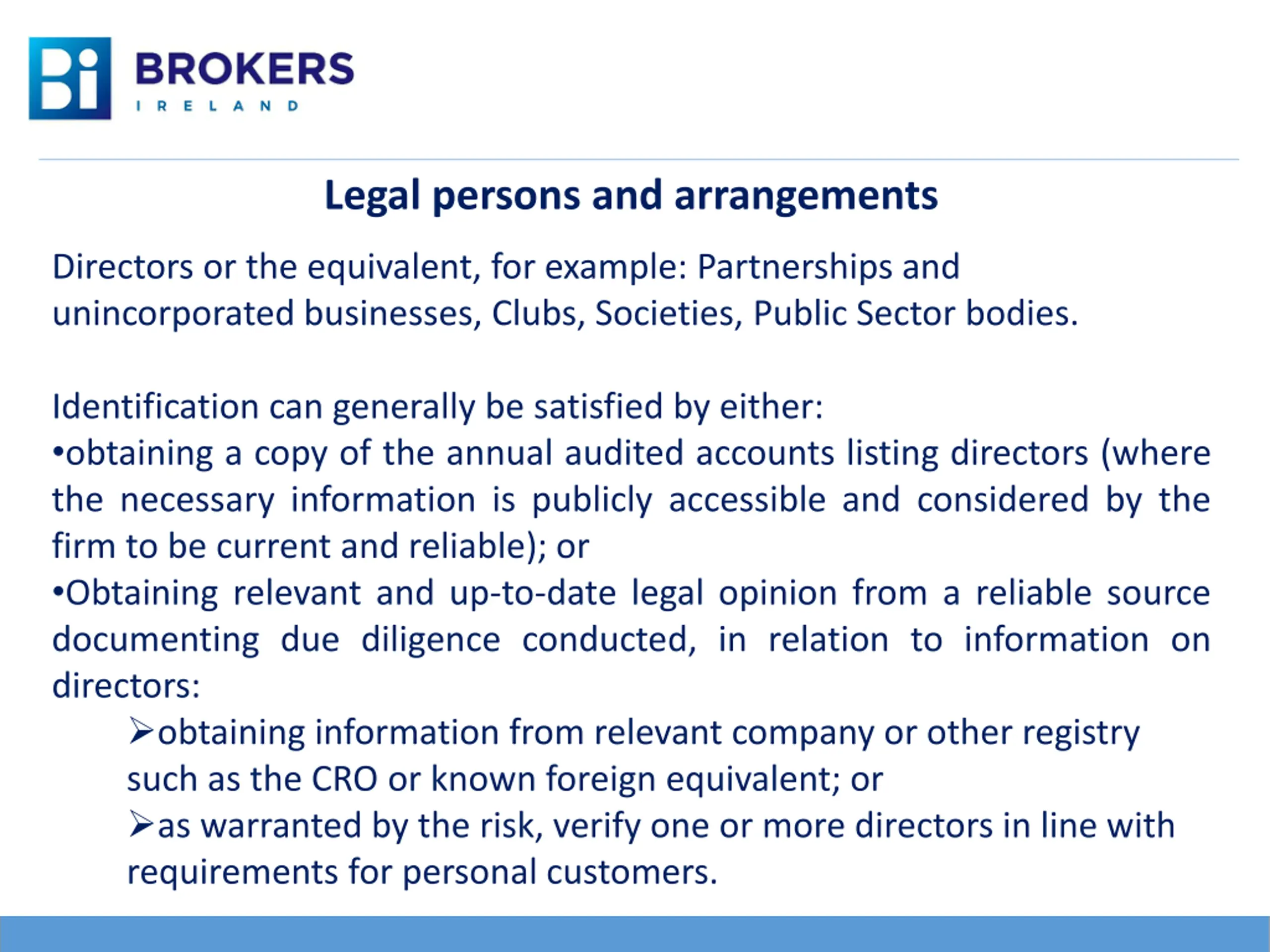 Legal persons and arrangements Directors or the equivalent, for example: Partnerships and unincorporated businesses, Clubs, Societies, Public Sector bodies. Identification can generally be satisfied by either: obtaining a copy of the annual audited accounts listing directors (where the necessary information is publicly accessible and considered by the firm to be current and reliable); or Obtaining relevant and up-to-date legal opinion from a reliable source documenting due diligence conducted, in relation to information on directors: obtaining information from relevant company or other registry such as the CRO or known foreign equivalent; or as warranted by the risk, verify one or more directors in line with requirements for personal customers.